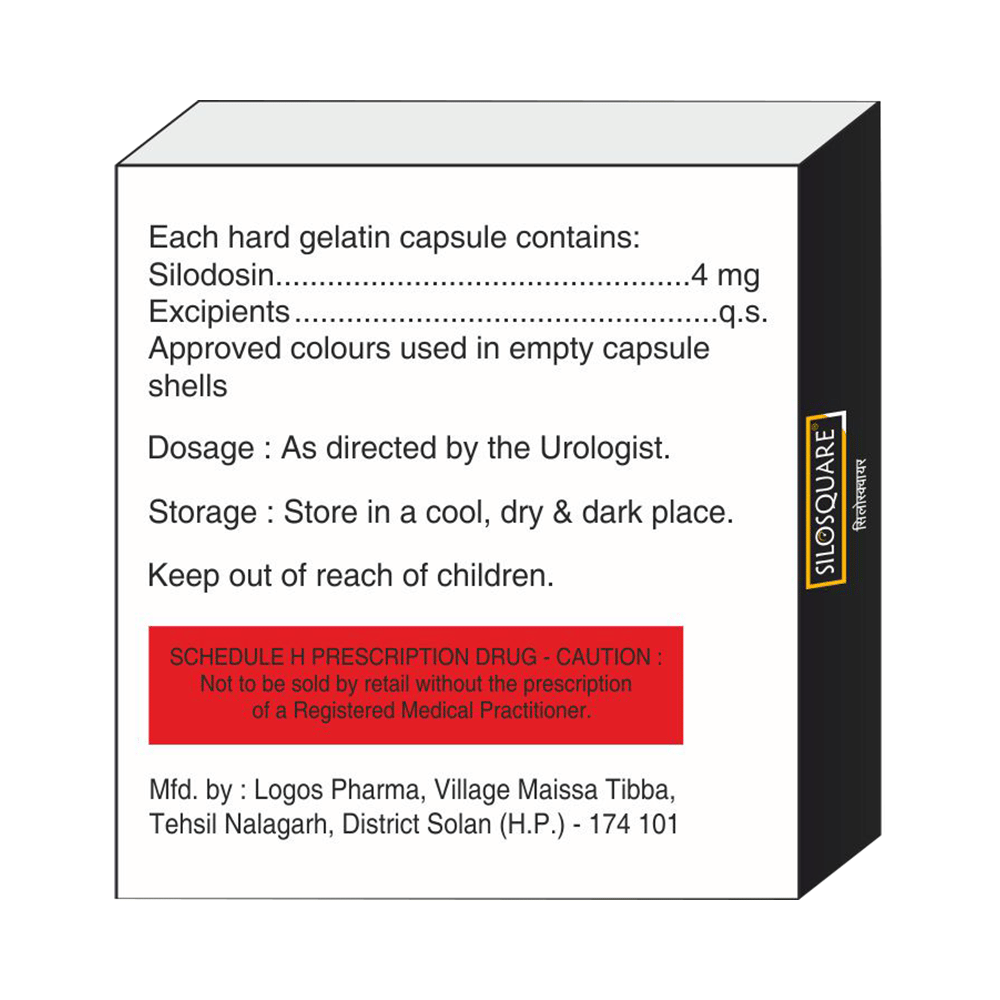 In Treatment of Benign prostatic hyperplasiaWhen your prostate gland becomes enlarged it can cause urinary problems such as difficulty passing urine and the need to go to the toilet frequently or urgently. It can also cause urine flow to be slower. If not treated, there is a risk that your urine flow will be completely blocked. Silosquare 4mg Capsule works by relaxing muscles in the bladder and prostate. So, it can rapidly relieve the symptoms and make it easier for you to urinate. Take this medicine exactly as prescribed for maximum benefits.