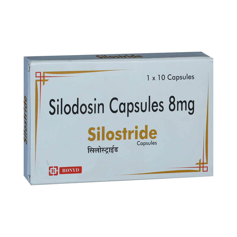 Silostride Capsule is an alpha-adrenergic antagonist that is used in the treatment of benign prostatic hyperplasia. It helps to relieve symptoms like difficulty in passing urine. However, it does not decrease the size of the prostate. Silostride Capsule is advised to take it in a dose and duration as per prescription. It should be taken with food, but take at the same time regularly. Swallow the medicine as a whole without crushing or chewing it. You should not stop taking the medicine without consulting the doctor as it may lead to the worsening of your symptoms. The course of the treatment should be completed for better efficacy of the medicine.Some common side effects of this medicine are retrograde ejaculation, dizziness, diarrhea, orthostatic hypotension, headache, nasopharyngitis, and nasal congestion. If any of the side effects persist or bother you, you must consult the doctor without delay.Simple lifestyle changes can help you manage your symptoms better. Try to urinate as soon as you feel the urge, however, never strain or push to empty your bladder. You should avoid drinking caffeinated or alcoholic drinks at night and a few hours before going to bed or going out.Before receiving the treatment, inform your doctor if you are on any medication for any other health condition. If you have to undergo eye surgery due to cataracts or glaucoma then inform your eye doctor about the usage of this medicine. Patients with liver or kidney disease must be cautious while receiving the prescription, and they must receive regular follow-ups as per the doctor’s advice.