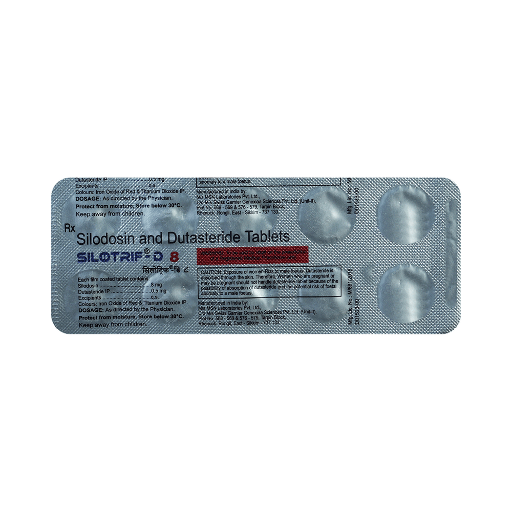 In Treatment of Benign prostatic hyperplasiaWhen your prostate gland becomes enlarged it can cause urinary problems such as difficulty passing urine and a need to go to the toilet frequently or urgently. It can also cause urine flow to be slower. If not treated, there is a risk that your urine flow will be completely blocked. Silotrif-D 8 Tablet is a combination of two medicines that reduces the size of your prostate by blocking the production of a hormone which causes it to grow. Additionally, it relaxes the muscles in the bladder and prostate. Together they can rapidly relieve the symptoms and make it easier for you to urinate. However, it may take up to 6 months to notice the full benefits. Take this medicine exactly as prescribed for maximum benefits.