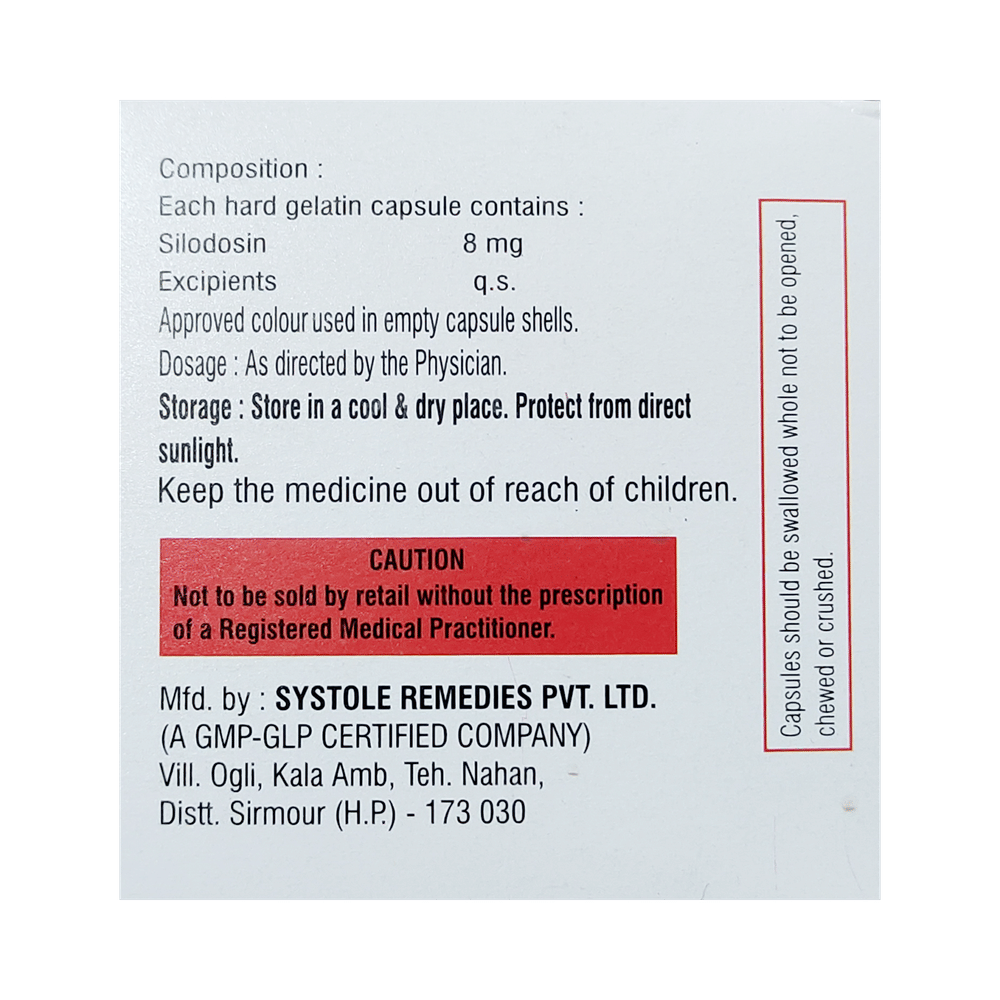 Silovact 8 Capsule is an alpha-adrenergic antagonist that is used in the treatment of benign prostatic hyperplasia. It helps to relieve symptoms like difficulty in passing urine. However, it does not decrease the size of the prostate. Silovact 8 Capsule is advised to take it in a dose and duration as per prescription. It should be taken with food, but take at the same time regularly. Swallow the medicine as a whole without crushing or chewing it. You should not stop taking the medicine without consulting the doctor as it may lead to the worsening of your symptoms. The course of the treatment should be completed for better efficacy of the medicine.Some common side effects of this medicine are retrograde ejaculation, dizziness, diarrhea, orthostatic hypotension, headache, nasopharyngitis, and nasal congestion. If any of the side effects persist or bother you, you must consult the doctor without delay.Simple lifestyle changes can help you manage your symptoms better. Try to urinate as soon as you feel the urge, however, never strain or push to empty your bladder. You should avoid drinking caffeinated or alcoholic drinks at night and a few hours before going to bed or going out.Before receiving the treatment, inform your doctor if you are on any medication for any other health condition. If you have to undergo eye surgery due to cataracts or glaucoma then inform your eye doctor about the usage of this medicine. Patients with liver or kidney disease must be cautious while receiving the prescription, and they must receive regular follow-ups as per the doctor’s advice.