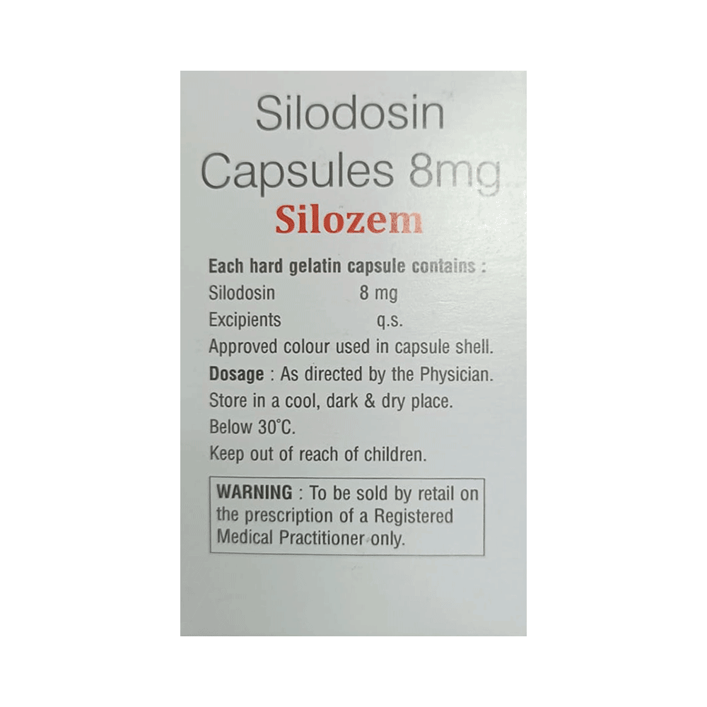 Silozem 8mg Capsule is an alpha-adrenergic antagonist that is used in the treatment of benign prostatic hyperplasia. It helps to relieve symptoms like difficulty in passing urine. However, it does not decrease the size of the prostate. Silozem 8mg Capsule is advised to take it in a dose and duration as per prescription. It should be taken with food, but take at the same time regularly. Swallow the medicine as a whole without crushing or chewing it. You should not stop taking the medicine without consulting the doctor as it may lead to the worsening of your symptoms. The course of the treatment should be completed for better efficacy of the medicine.Some common side effects of this medicine are retrograde ejaculation, dizziness, diarrhea, orthostatic hypotension, headache, nasopharyngitis, and nasal congestion. If any of the side effects persist or bother you, you must consult the doctor without delay.Simple lifestyle changes can help you manage your symptoms better. Try to urinate as soon as you feel the urge, however, never strain or push to empty your bladder. You should avoid drinking caffeinated or alcoholic drinks at night and a few hours before going to bed or going out.Before receiving the treatment, inform your doctor if you are on any medication for any other health condition. If you have to undergo eye surgery due to cataracts or glaucoma then inform your eye doctor about the usage of this medicine. Patients with liver or kidney disease must be cautious while receiving the prescription, and they must receive regular follow-ups as per the doctor’s advice.