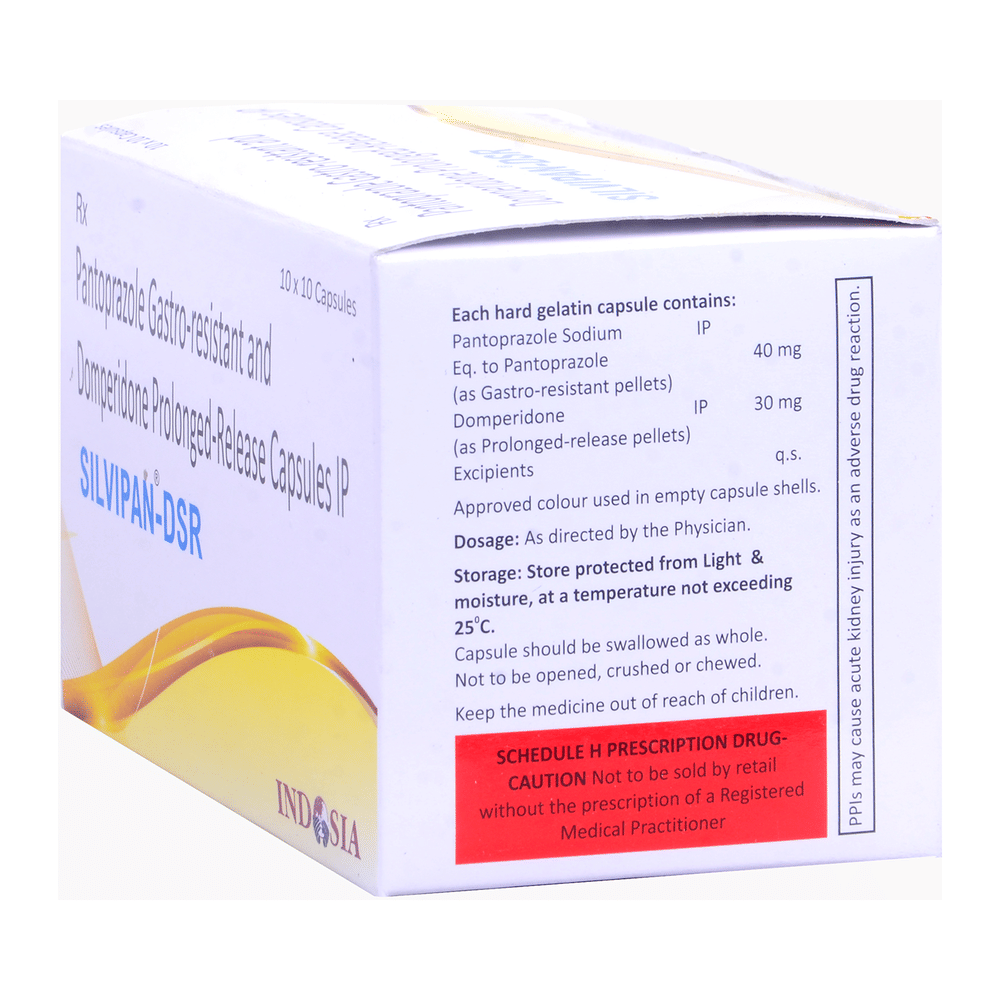 Silvipan-DSR Capsule is a medicine that is used to treat conditions like acid reflux disease (GERD), erosive esophagitis, gastritis, gastric and duodenal ulcers, and indigestion with symptoms like heartburn, bloating, and regurgitation. It works by lowering acid production and helping the stomach empty faster. Take Silvipan-DSR Capsule exactly as prescribed by your doctor, usually once daily before breakfast. Swallow it whole with water; do not crush or chew. To get the best results, maintain a healthy diet, avoid late-night meals, caffeine, spicy or oily foods, and stop smoking or alcohol use. Do not skip doses or stop early, even if you feel better, as that may lead to a return of the symptoms.The most common side effect of Silvipan-DSR Capsule is dry mouth. It may also cause headache, dizziness, diarrhea, nausea, or mild stomach discomfort in some people. These are usually temporary. If you experience persistent vomiting, irregular heartbeat, rash, or severe diarrhea, contact your doctor immediately. Staying hydrated and taking the medicine before meals may help reduce stomach-related side effects.Inform your doctor about any liver, kidney, or heart problems before starting Silvipan-DSR Capsule. Avoid taking it with other drugs that may affect heart rhythm or interact with domperidone or pantoprazole. Do not use it if you have a history of gastrointestinal bleeding or obstruction, or if you are allergic to any of the ingredients in the medicine. Pregnant or breastfeeding women should consult their doctor before use.