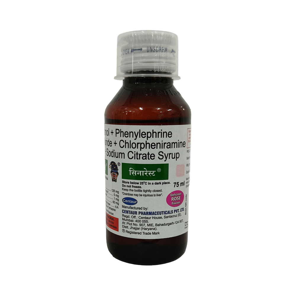 SINARest Syrup is a combination of four medicines: Chlorpheniramine Maleate, Phenylephrine, Paracetamol, and Sodium Citrate, which relieves common cold symptoms. Chlorpheniramine is an antiallergic that relieves allergy symptoms like runny nose, watery eyes, and sneezing. Phenylephrine is a decongestant that narrows the small blood vessels providing relief from congestion or stuffiness in the nose. Paracetamol is an analgesic (pain reliever) and an antipyretic (fever reducer). It blocks the release of certain chemical messengers in the brain that are responsible for pain and fever. Sodium citrate is a mucolytic that thins and loosens mucus (phlegm), making it easier to cough out.