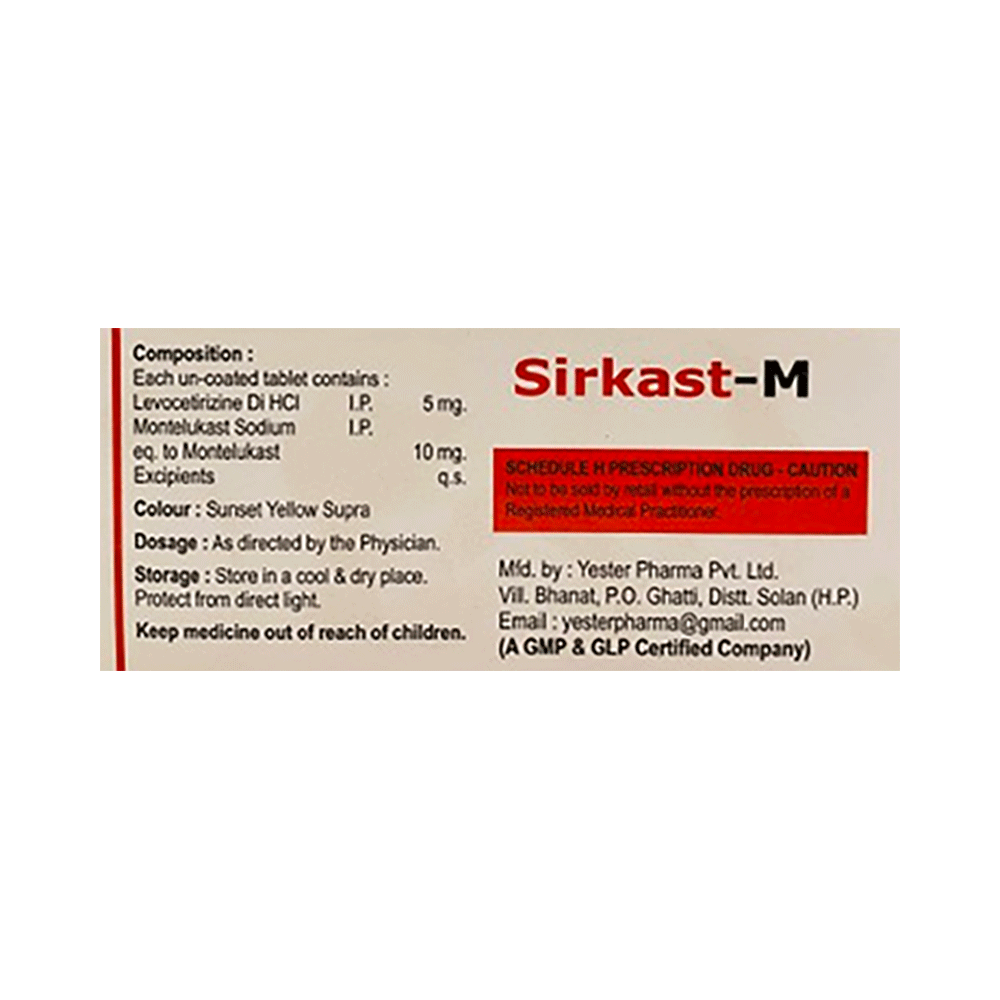 In Treatment of Allergic skin conditionsSirkast-M Tablet is effective in treating allergic skin conditions with inflammation and itching. It reduces the actions of chemicals in the body that cause inflammation of the skin. When used correctly it is a safe and effective treatment. It reduces the redness, rash, pain or itchiness caused by your skin’s reaction to an irritant. It thus improves your self-esteem and confidence as your appearance changes. Keep taking it for as long as it is prescribed to get the full benefits.In Treatment of Sneezing and runny nose due to allergiesSirkast-M Tablet is a combination medicine that provides relief from symptoms such as blocked or runny nose, sneezing and itchy or watery eyes. This will make it easier for you to go about your daily activities. It rarely has any serious side effects and you may only need to take it on days you have symptoms. If you are taking it to prevent getting symptoms you should use it regularly to get the most benefit.In Treatment of Hay feverHay fever, also called allergic rhinitis, causes cold-like signs and symptoms, such as a runny nose, itchy eyes, congestion, sneezing and sinus pressure. The only difference is that in hay fever, these symptoms are not produced due to a virus but are simply allergic responses of our body to allergens (allergy causing agents such as pollen). Sirkast-M Tablet is used to provide relief from these symptoms of hay fever. It works by blocking the release of the chemical substance responsible for producing such allergy symptoms. Sirkast-M Tablet is a safe medicine which helps treat hay fever and makes us feel at ease.show moreshow less