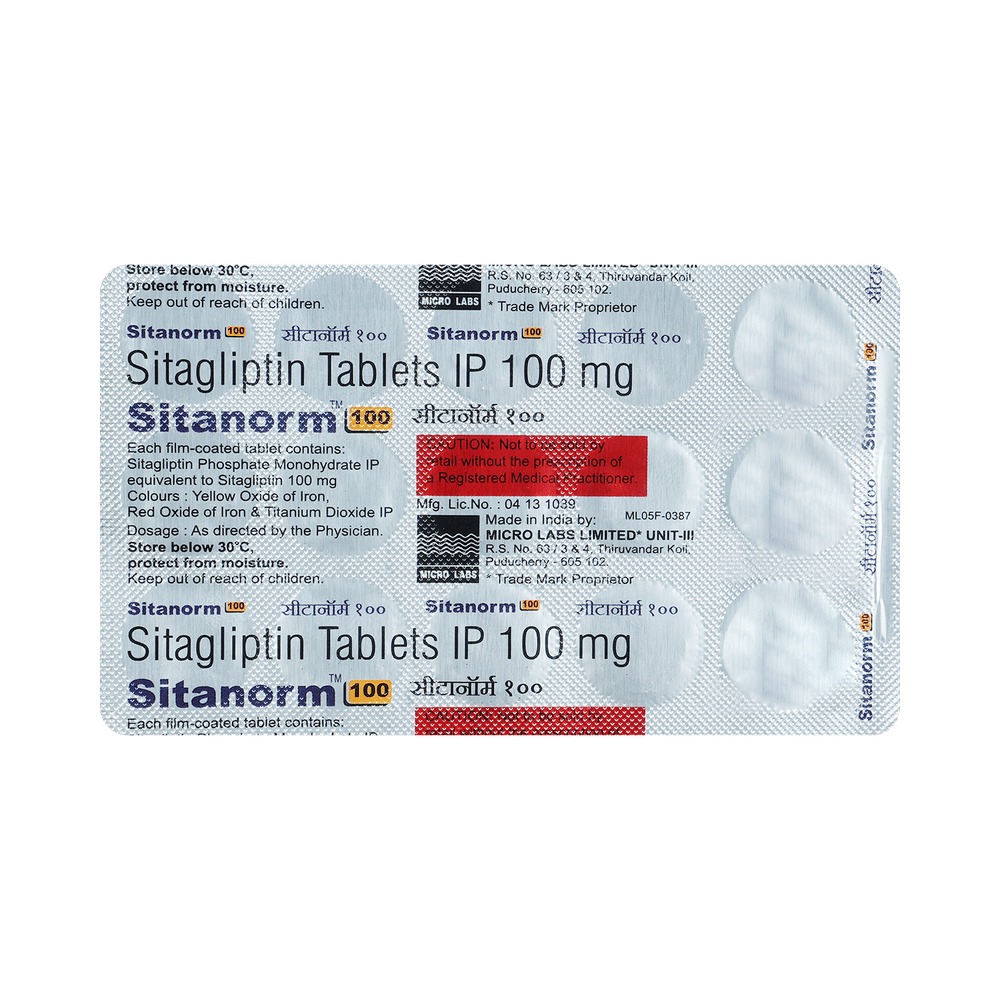 Sitanorm 100mg Tablet is a medicine used to treat type 2 diabetes mellitus. It is used together with a healthy diet and regular exercise to control blood sugar levels. This helps to prevent serious complications of diabetes like kidney damage and blindness. Sitanorm 100mg Tablet is normally prescribed when diet and exercise alone or other medicines do not prove sufficient to control your blood sugar level. Your doctor may prescribe it alone or along with other diabetes medicines. It may be taken on an empty stomach or with a meal. The dose will depend on your condition and blood sugar levels. Therefore, you should use it as advised by your doctor.You should take it regularly at the same time each day to get the most benefit, and you should not stop unless your doctor recommends it. This medicine helps you to control your blood sugar levels and prevent serious complications in the future. It is important to stay on the diet and exercise program recommended by your doctor while taking this medicine. Your lifestyle plays a big part in controlling diabetes.The most common side effect of taking this medicine is a headache. This is usually minor and improves with time. Low blood sugar level (hypoglycemia) is a possible side effect if you are also taking other diabetes medicines like insulin or sulfonylurea, so you need to know how to recognize and deal with it. It may also cause upper respiratory tract infections like a sore throat, cough, and cold. Contact your doctor if the side effects worry you or if they do not go away.Before taking this medicine, let your doctor know if you have ever had kidney disease, heart or pancreas problems, or if you drink a lot of alcohol. Pregnant or breastfeeding women should also consult their doctor before taking it. Some other medicines you are taking may interfere with this medicine. So, make sure your doctor knows about all the other medicines you are using. Limit your alcohol intake while taking this medicine because it can increase your risk of developing low blood sugar levels. You may need regular tests, such as kidney function and blood glucose levels, to check that the medicine is working properly.