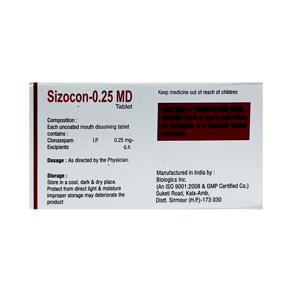 Sizocon 0.25 MD Tablet is a prescription medicine used to treat epilepsy (seizures) and anxiety disorder. It helps to decrease the abnormal and excessive activity of the nerve cells and calms the brain. Sizocon 0.25 MD Tablet may be taken with or without food. However, take it at the same time each day as this helps to maintain a consistent level of medicine in the body. Take this medicine in the dose and duration as advised by your doctor as it has a high potential of habit-forming. If you have missed a dose, take it as soon as you remember it and finish the full course of treatment even if you feel better. You should not stop this medicine suddenly without talking to your doctor as it may increase the seizure frequency and can cause nausea, anxiety, flu-like symptoms, and muscle pain.Some common side effects of this medicine include fatigue, depression and impaired coordination. It may also cause dizziness and sleepiness, so do not drive or do anything that requires mental focus until you know how this medicine affects you. It is important to inform your doctor if you develop any unusual changes in mood or depression as this medicine may cause suicidal thoughts.