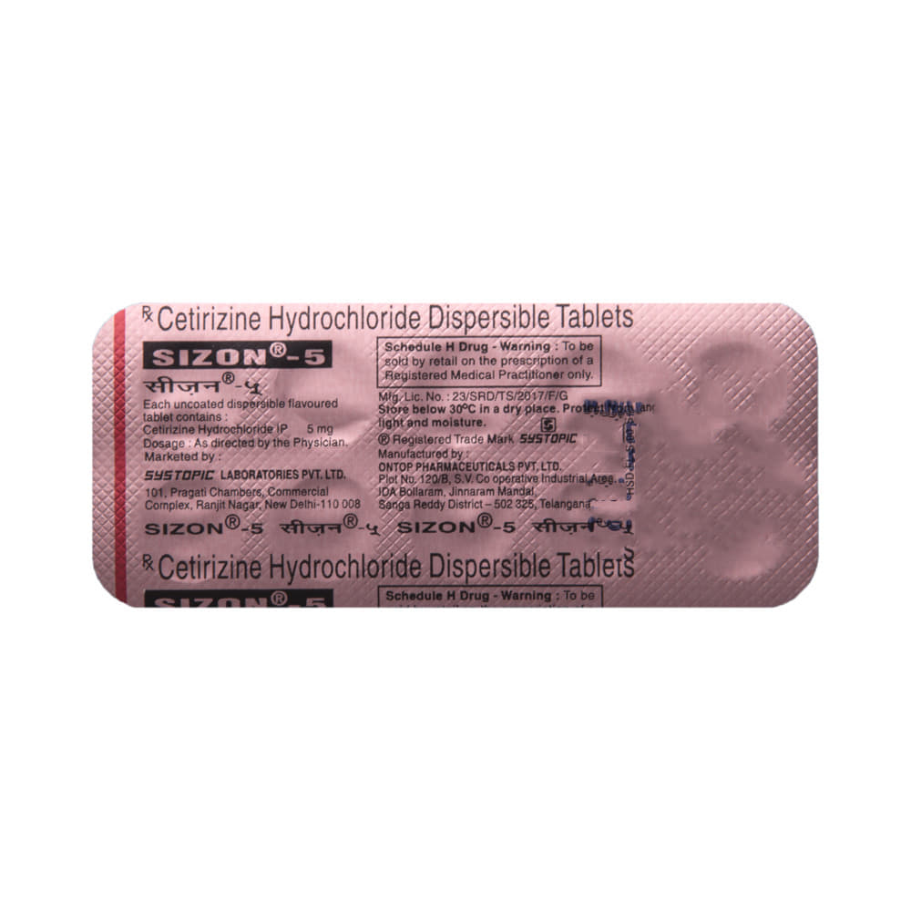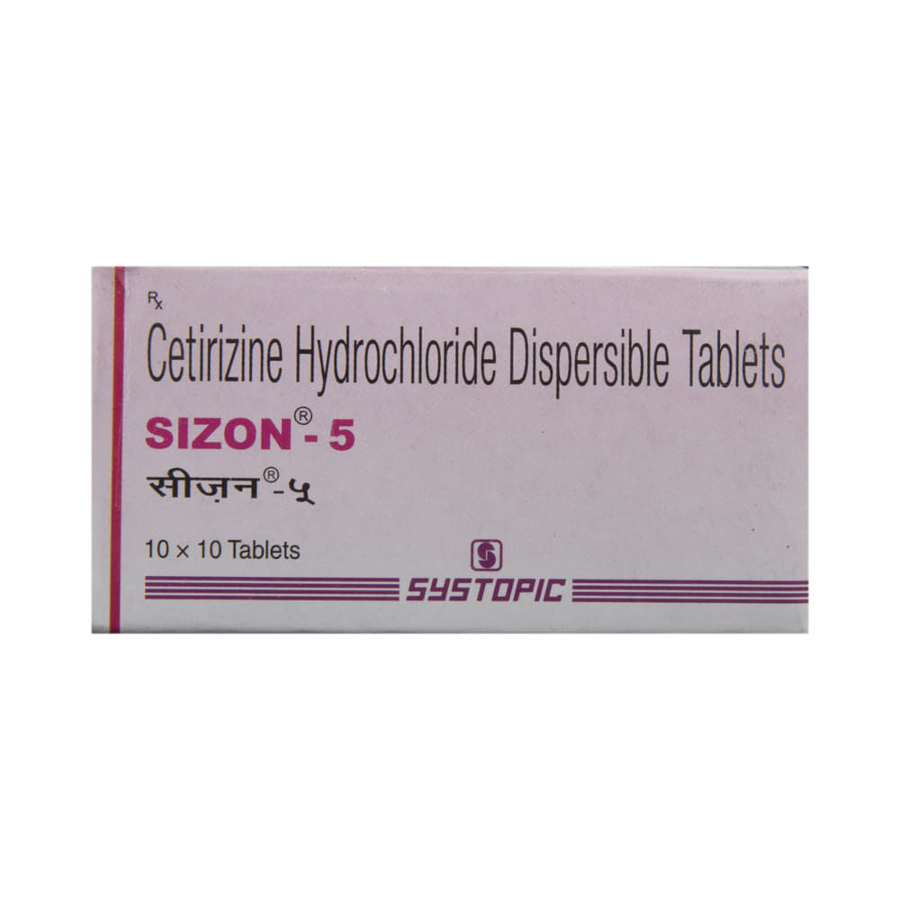 SizoN 5 Tablet is given to children to treat various symptoms such as watery eyes, runny nose, sneezing, and itching associated with allergic conditions like hay fever, urticaria (hives), conjunctivitis (red, itchy eye), and common cold. Give this medicine to your child orally with or without food in the dose, time, and way prescribed by your child’s doctor. It could either be prescribed alone or in combination with other medicines. The allergic symptoms may subside after your child has taken the initial few doses of SizoN 5 Tablet. In case of serious allergic conditions, your child may have to continue taking the medicine for a week or two. If your child vomits within 30 minutes of taking this medicine, repeat the same dose after your child feels better. But, refrain from doing so if it is already time for the next dose.Your child may experience mild side effects like nausea, vomiting, dry mouth, dizziness, sleepiness, sore throat, runny nose, and headache after taking this medicine. These symptoms are usually non-serious and disappear on their own. However, in case of prolonged or bothersome events, it would be best to consult your child’s doctor without any delay.Inform your child’s doctor if your child is on any medicines or is allergic to any medicine, product, or food. Do inform the doctor if your child has or had any heart, liver, kidney problems or was born prematurely. Share any history regarding bowel obstruction, malnutrition, weight-related issues, and thyroid problems with the doctor. Knowledge of your child’s medical history will help avoid any complications in the treatment and guide your child’s doctor to plan your child’s overall treatment better.