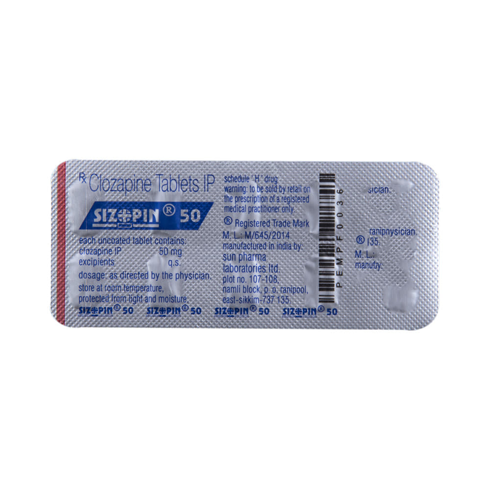 SizoPIN 50 Tablet is used in the treatment of schizophrenia (a mental disorder that can result in hallucinations or delusions and also adversely affects a person’s ability to think and behave). SizoPIN 50 Tablet may be taken with or without food. However, it is advised to take it at the same time each day as this helps to maintain a consistent level of medicine in the body. Take this medicine in the dose and duration as advised by your doctor and if you have missed a dose, take it as soon as you remember. Do not skip any doses and finish the full course of treatment even if you feel better. It is important that this medication is not stopped suddenly without talking to your doctor as it may worsen your symptoms.Some common side effects of this medicine include hypotension, dry mouth, headache, increased sweating, visual disturbance, and decreased blood pressure. Please consult your doctor if these side effects do not get better or worse.Before taking this medicine it is important to inform your doctor if your suffering from high body temperature and muscle stiffness (neuroleptic malignant syndrome), have had abnormal tongue or face movements (dyskinesia), heart disease, diabetes, Parkinson’s disease, dementia, fits (epilepsy), difficulty in swallowing (dysphagia), or liver problems.