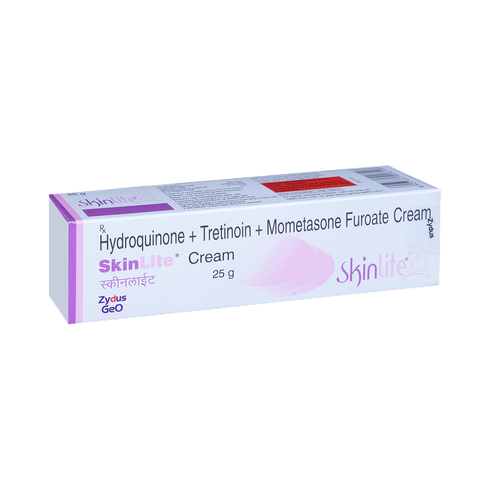 Skinlite Cream is a combination of three medicines: Hydroquinone, Mometasone and Tretinoin, which treats melasma (dark spots on skin). Hydroquinone is a skin lightening medicine. It reduces the amount of a skin pigment (melanin) that causes darkening of skin. This effect is reversible. Mometasone is a steroid which blocks the production of certain chemical messengers (prostaglandins) that make the skin red, swollen and itchy. Tretinoin is a form of vitamin A that helps the skin to renew itself more quickly.