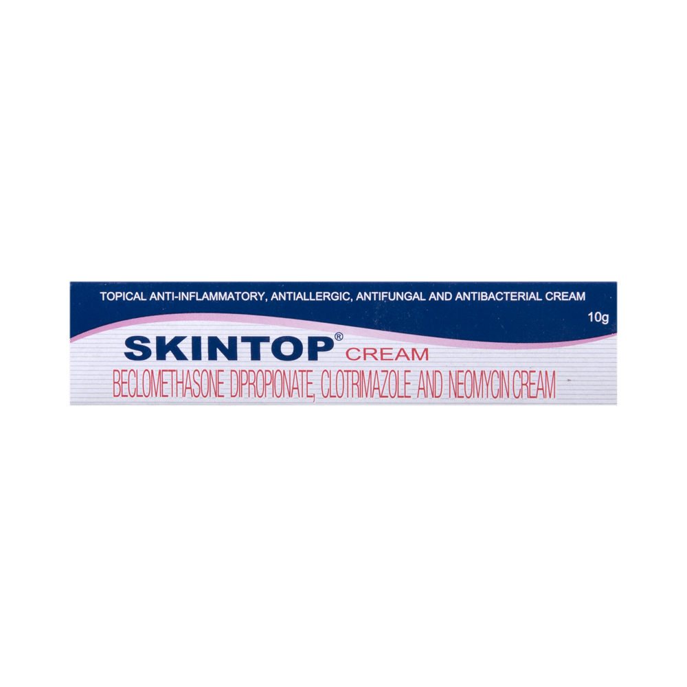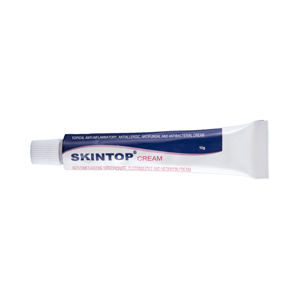 Skintop Cream is a combination medicine that is used to treat various types of skin infections. It minimizes symptoms of inflammation such as redness, swelling, and itching. It also has antimicrobial action against infection-causing microorganisms. Skintop Cream is only meant for external use and should be used as advised by your doctor. A thin layer of the medicine should be applied only to the affected areas of the skin with clean and dry hands. If it gets into your eyes, nose, mouth, or vagina rinse with water. It may take several days to weeks for your symptoms to improve, but you should keep using this medicine regularly. The course of the treatment should be completed to ensure better efficacy of the medicine. If your condition does not improve or gets worse, you should talk to your doctor.The most common side effect of this medicine includes itching, dryness, redness, and burning sensation at the application site. These are usually self-limiting. Serious side effects are rare. You must consult the doctor if you experience any allergic reaction (rashes, itching, swelling, shortness of breath, etc.).Before taking this medicine, it is important to tell your doctor if you are taking or have recently taken any other medicines for the same disease or other diseases. Pregnant and breastfeeding women should take this medicine with proper consultation and caution. If you are a known allergic to the medicine, you must refrain from using this medicine. You should consult the doctor about prescribing an alternative medicine for your condition.