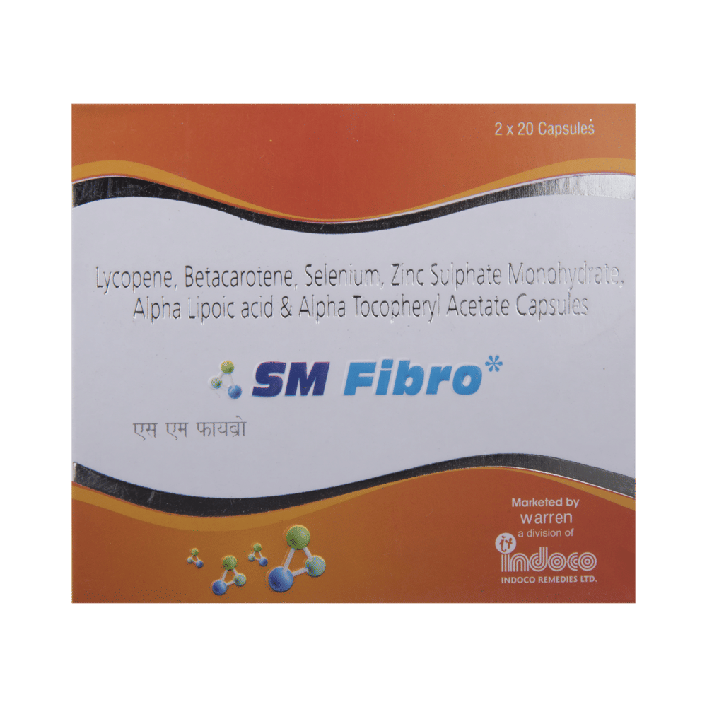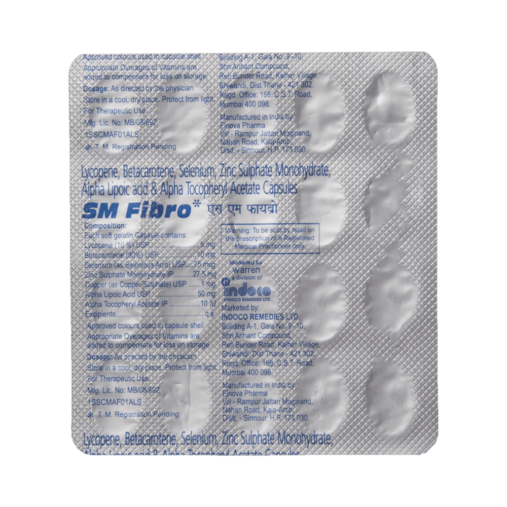 SM Fibro Soft Gelatin Capsule is a nutritional supplement containing vitamins, minerals, and antioxidants used to treat and prevent nutritional deficiencies in the body. It provides antioxidant protection, boosts immune function, and supports the health of skin, eyes, and other organs. SM Fibro Soft Gelatin Capsule may be taken with or without food. However, taking it with food can increase absorption and prevent an upset stomach. Take it in the exact dose and duration advised by your doctor. Taking more than the recommended dose may lead to unwanted side effects. To complement the medicine, maintain a balanced diet rich in fruits, vegetables, and proteins.SM Fibro Soft Gelatin Capsule is well-tolerated with little or no side effects. However, some may experience mild side effects like nausea, stomach discomfort, or a slight metallic taste in the mouth. These side effects are generally temporary and may be reduced by taking the supplement with food. If these symptoms persist or worsen, contact your doctor.Avoid taking other vitamin or mineral supplements alongside SM Fibro Soft Gelatin Capsule unless approved by your doctor, as this could lead to excessive intake of certain nutrients. Do not take this medicine if you have a known history of allergic reactions to any of its ingredients. Pregnant and breastfeeding women should consult their doctor before use to make sure it is safe.