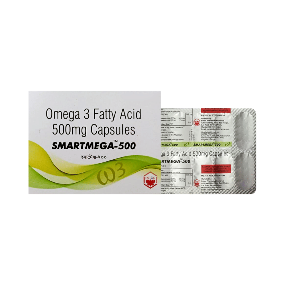 Smartmega 500 Soft Gelatin Capsule is a medicine used in the treatment of nutritional deficiencies. It is an essential nutrient with good antioxidant property. It is beneficial for healthy heart, blood vessels, brain, and eye in addition to many other health benefits. Smartmega 500 Soft Gelatin Capsule is best taken with food. This will prevent you from gastrointestinal disturbances. Take it in the dose and duration advised by the doctor. Take it regularly and at the same time each day to get maximum benefits from it. Do not take it more than or longer than prescribed by the doctor, as that may cause harmful effects.Common side effects of this medicine include nausea, vomiting, and flatulence. If any of these side effects do not resolve on their own or get worse, let your doctor know. To make sure it is safe for you, let your doctor know about all the other medicines you are taking. Use this medicine with caution if you are allergic to fish or fish products.