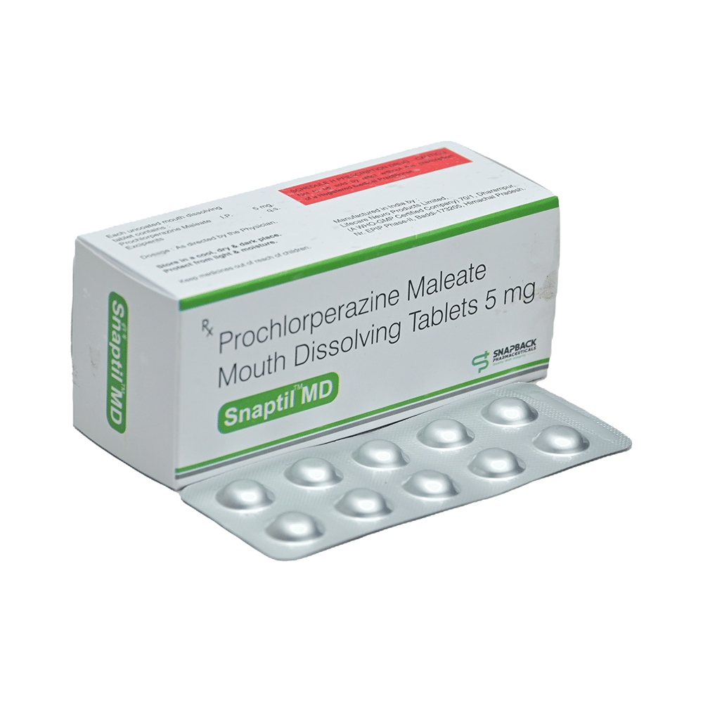 Snaptil MD Tablet is a vestibular suppressant, i.e., it suppresses the vestibular apparatus in the inner ear by blocking the H1 receptor and stops vertigo. It acts within 30 minutes and, therefore, is effective during acute attacks. It also acts as a dopamine antagonist. Dopamine controls the region in the brain that causes nausea and vomiting, and this medicine blocks the action of dopamine. Therefore, Snaptil MD Tablet shows an anti-nauseating and antiemetic action. The mechanism of action by which prochlorperazine relieve headache and anxiety is probably related to it being serotonin (5HT3) receptor antagonist and dopamine (D2) receptor antagonist.