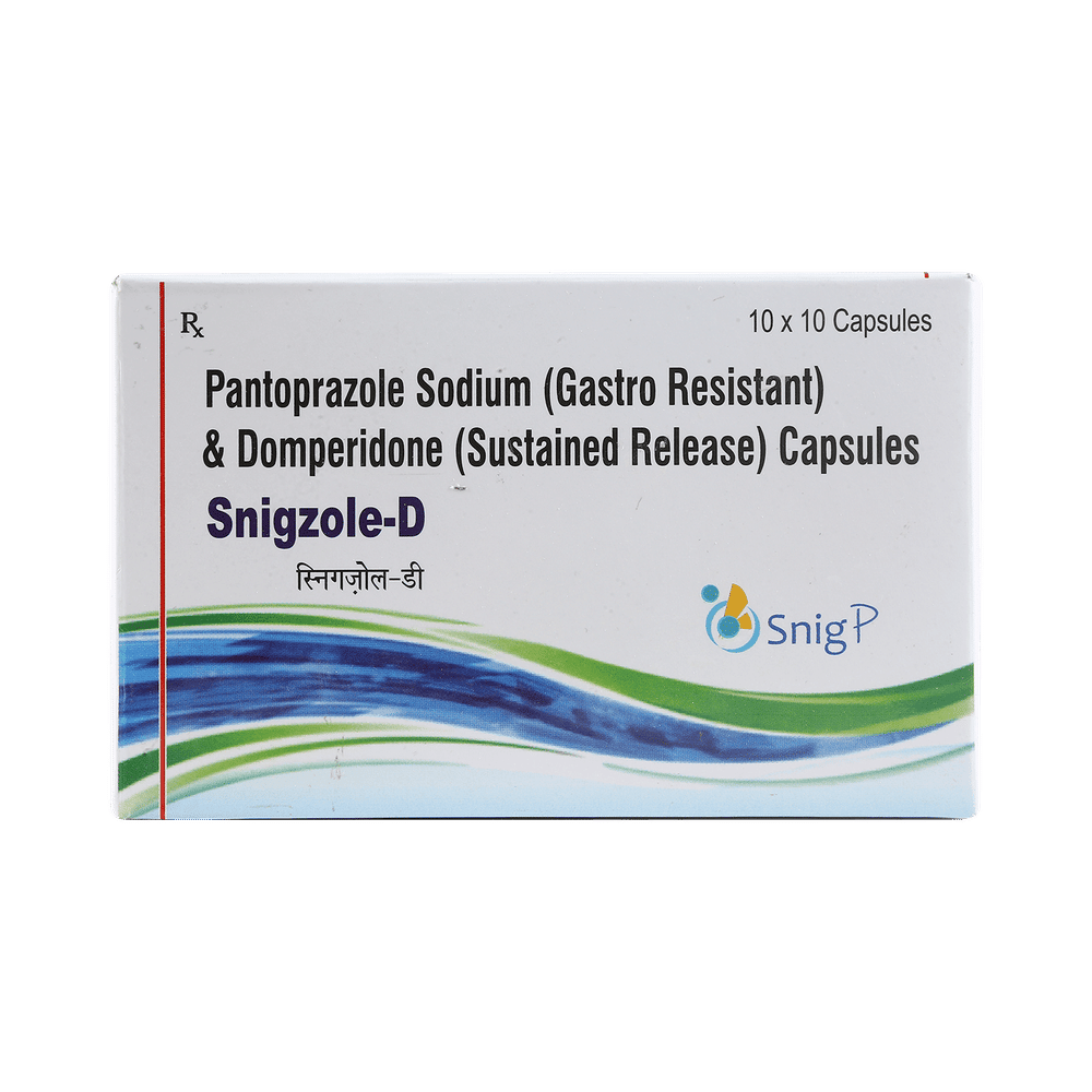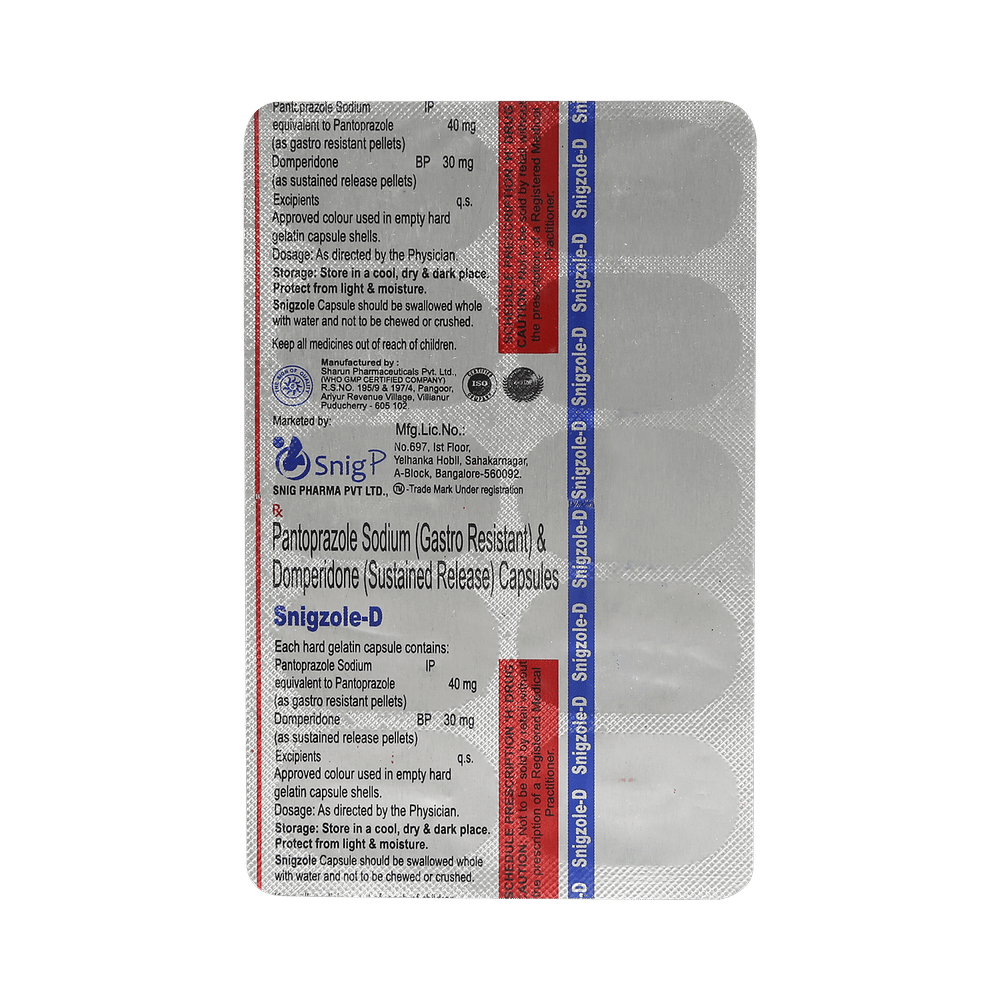 Snigzole D 30mg/40mg Capsule is a medicine that is used to treat conditions like acid reflux disease (GERD), erosive esophagitis, gastritis, gastric and duodenal ulcers, and indigestion with symptoms like heartburn, bloating, and regurgitation. It works by lowering acid production and helping the stomach empty faster. Take Snigzole D 30mg/40mg Capsule exactly as prescribed by your doctor, usually once daily before breakfast. Swallow it whole with water; do not crush or chew. To get the best results, maintain a healthy diet, avoid late-night meals, caffeine, spicy or oily foods, and stop smoking or alcohol use. Do not skip doses or stop early, even if you feel better, as that may lead to a return of the symptoms.The most common side effect of Snigzole D 30mg/40mg Capsule is dry mouth. It may also cause headache, dizziness, diarrhea, nausea, or mild stomach discomfort in some people. These are usually temporary. If you experience persistent vomiting, irregular heartbeat, rash, or severe diarrhea, contact your doctor immediately. Staying hydrated and taking the medicine before meals may help reduce stomach-related side effects.Inform your doctor about any liver, kidney, or heart problems before starting Snigzole D 30mg/40mg Capsule. Avoid taking it with other drugs that may affect heart rhythm or interact with domperidone or pantoprazole. Do not use it if you have a history of gastrointestinal bleeding or obstruction, or if you are allergic to any of the ingredients in the medicine. Pregnant or breastfeeding women should consult their doctor before use.