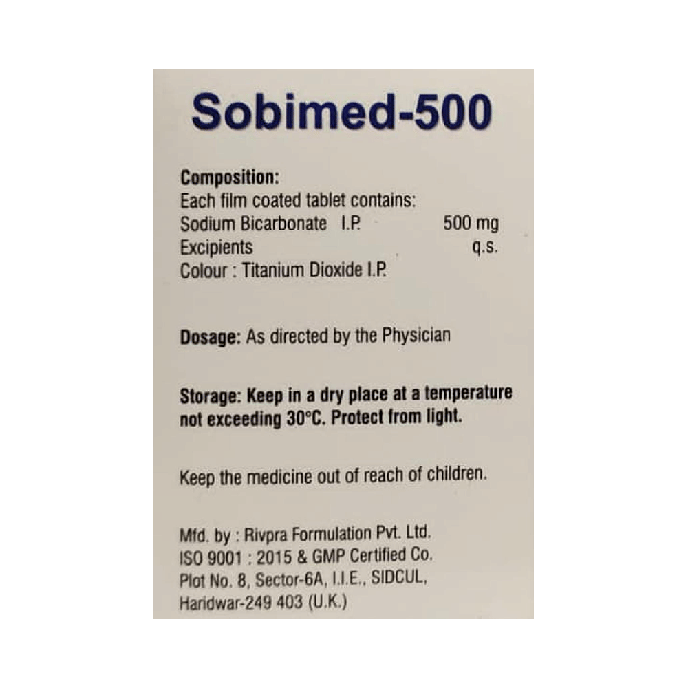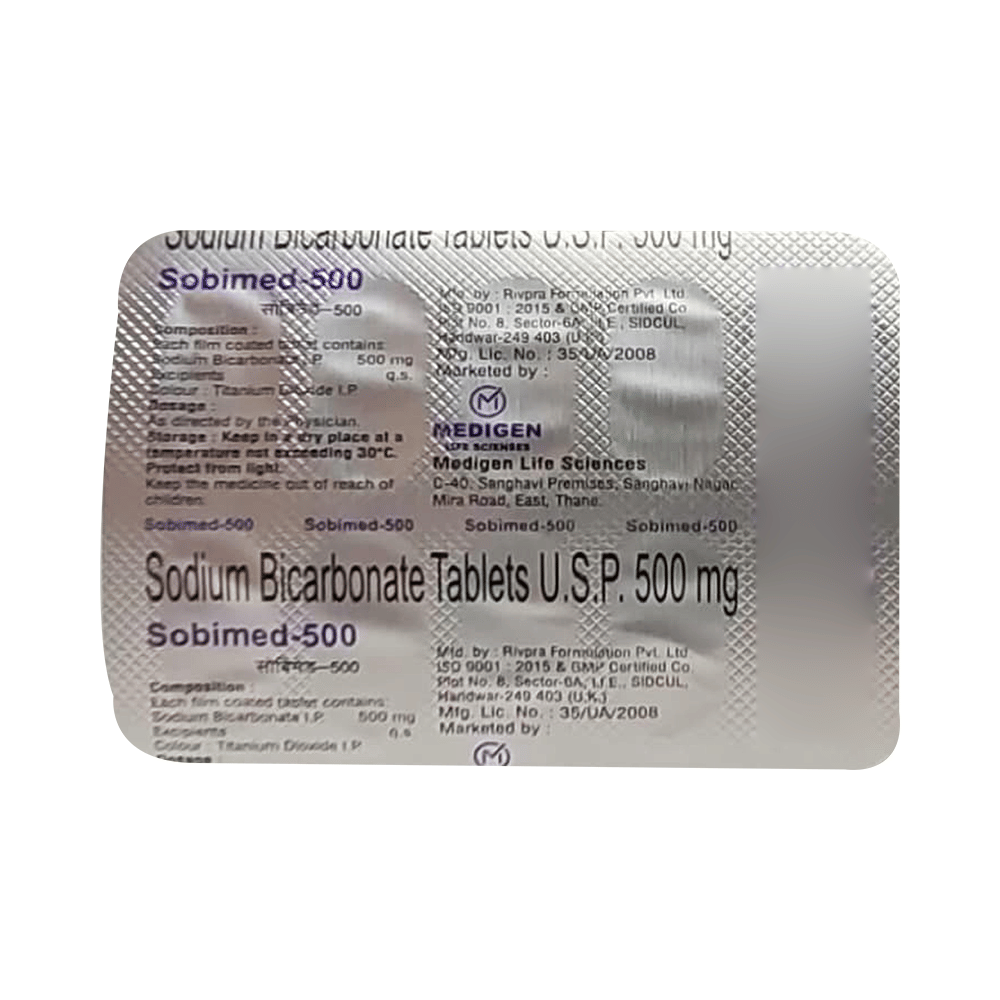 Sobimed 500 Tablet is an antacid used in the treatment of indigestion, metabolic acidosis and used as an alkalinizing agent. It acts as a buffer that helps neutralize excess acid and restore a healthier pH level in the body. Sobimed 500 Tablet relieves irritation by producing carbon dioxide which neutralizes the acid present in the stomach. It also increases the pH of blood and urine, thereby correcting acid indigestion, heartburn. Additionally, it helps in the removal of toxic substances from the body in certain types of poisoning.Sobimed 500 Tablet may be taken with or without food in a dose and duration as advised by the doctor. Excessive intake may cause electrolyte imbalance leading to unwanted side effects. Keep taking this medicine for as long as your doctor recommends. If you stop treatment too early your symptoms may come back and your condition may worsen.Common side effects of this medicine include high sodium levels, cerebral edema, alkalosis, and hypokalemia. Let your doctor know if any of these side effects persist or get worse. They may be able to help by adjusting the dosage or by prescribing you an alternate medicine.It is important to consult a doctor before taking Sobimed 500 Tablet if you are suffering from stomach and kidney disease. Let your doctor also know about all other medications you are taking as some may affect, or be affected by this medicine. Pregnant or breastfeeding women should also consult their doctor before taking this medicine.