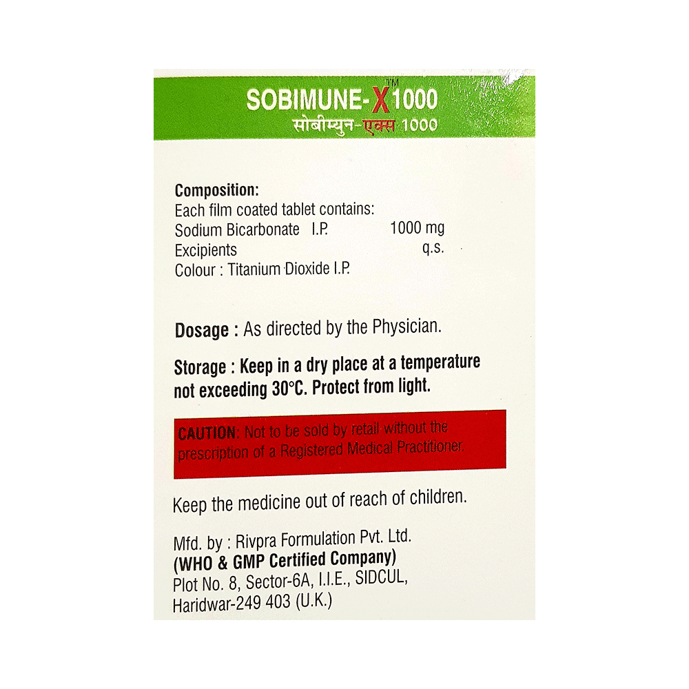 In Treatment of IndigestionIndigestion is a feeling of discomfort or a burning sensation in the upper part of your stomach. It also causes stomach pain and a feeling of fullness. Sobimune-X 1000 Tablet treats indigestion and thus gives relief from its symptoms by reducing the amount of acid in the stomach. Sobimune-X 1000 Tablet also gives relief from excess gas by breaking trapped gas and allows its easy passage. Take Sobimune-X 1000 Tablet as prescribed by the doctor. Think about what foods trigger indigestion and try to avoid them; eat smaller, more frequent meals; try to lose weight if you are overweight, and try to find ways to relax. Avoid eating within 3-4 hours of going to bed.In Treatment of Alkalinizing agentAlkalinizing agents are medicines used to manage disorders associated with low pH. Sobimune-X 1000 Tablet is used to treat metabolic acidosis (a condition where there is too much acid in the body) due to kidney failure. It helps restore the lost electrolyte balance and raises the pH of the urine and blood. This prevents complications that may arise due to metabolic acidosis such as osteoporosis, kidney damage, weakening of muscles, fatigue etc. It is given as an injection by a doctor or nurse and should not be self-administered. Follow your doctor’s instructions carefully to get the most benefit.In Treatment of Metabolic acidosisMetabolic acidosis occurs when the body accumulates too much acid or loses too much base, leading to a disrupted pH level. Sobimune-X 1000 Tablet acts as a buffer that helps neutralize excess acid and restore a healthier pH level. This prevents further complications related to the acidosis, such as organ dysfunction and electrolyte imbalances. This way it supports the proper functioning of various bodily systems and promotes overall health.show moreshow less