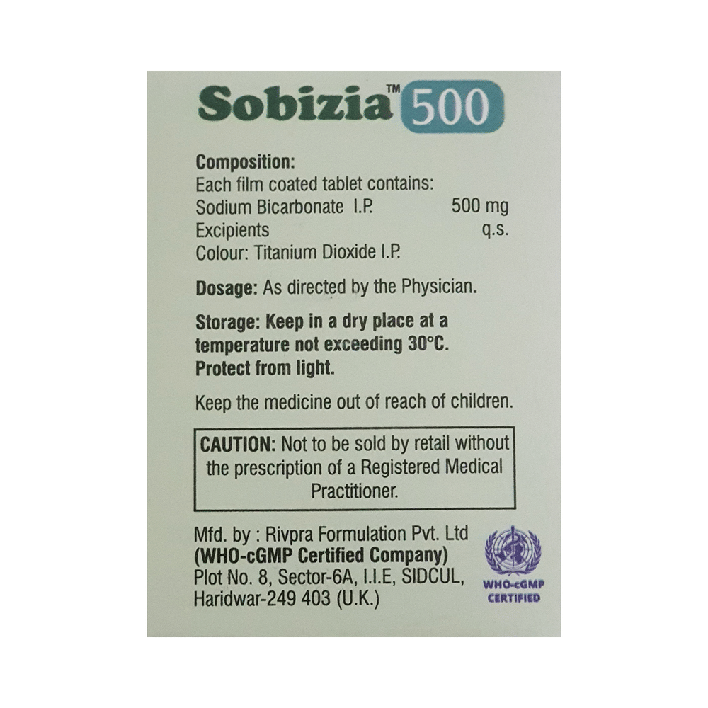 In Treatment of IndigestionIndigestion is a feeling of discomfort or a burning sensation in the upper part of your stomach. It also causes stomach pain and a feeling of fullness. Sobizia 500 Tablet treats indigestion and thus gives relief from its symptoms by reducing the amount of acid in the stomach. Sobizia 500 Tablet also gives relief from excess gas by breaking trapped gas and allows its easy passage. Take Sobizia 500 Tablet as prescribed by the doctor. Think about what foods trigger indigestion and try to avoid them; eat smaller, more frequent meals; try to lose weight if you are overweight, and try to find ways to relax. Avoid eating within 3-4 hours of going to bed.In Treatment of Alkalinizing agentAlkalinizing agents are medicines used to manage disorders associated with low pH. Sobizia 500 Tablet is used to treat metabolic acidosis (a condition where there is too much acid in the body) due to kidney failure. It helps restore the lost electrolyte balance and raises the pH of the urine and blood. This prevents complications that may arise due to metabolic acidosis such as osteoporosis, kidney damage, weakening of muscles, fatigue etc. It is given as an injection by a doctor or nurse and should not be self-administered. Follow your doctor’s instructions carefully to get the most benefit.In Treatment of Metabolic acidosisMetabolic acidosis occurs when the body accumulates too much acid or loses too much base, leading to a disrupted pH level. Sobizia 500 Tablet acts as a buffer that helps neutralize excess acid and restore a healthier pH level. This prevents further complications related to the acidosis, such as organ dysfunction and electrolyte imbalances. This way it supports the proper functioning of various bodily systems and promotes overall health.show moreshow less