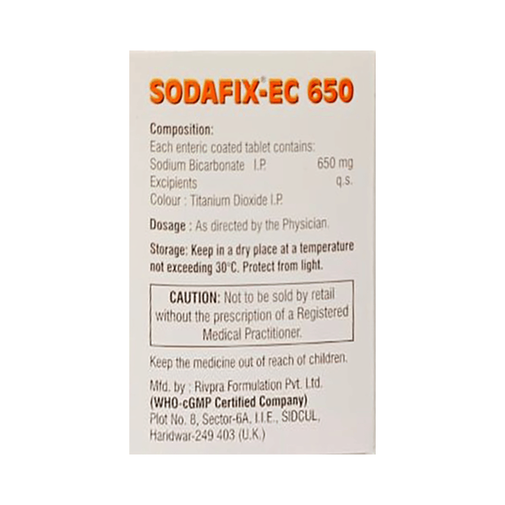 In Treatment of IndigestionIndigestion is a feeling of discomfort or a burning sensation in the upper part of your stomach. It also causes stomach pain and a feeling of fullness. Sodafix-EC 650 Tablet treats indigestion and thus gives relief from its symptoms by reducing the amount of acid in the stomach. Sodafix-EC 650 Tablet also gives relief from excess gas by breaking trapped gas and allows its easy passage. Take Sodafix-EC 650 Tablet as prescribed by the doctor. Think about what foods trigger indigestion and try to avoid them; eat smaller, more frequent meals; try to lose weight if you are overweight, and try to find ways to relax. Avoid eating within 3-4 hours of going to bed.In Treatment of Alkalinizing agentAlkalinizing agents are medicines used to manage disorders associated with low pH. Sodafix-EC 650 Tablet is used to treat metabolic acidosis (a condition where there is too much acid in the body) due to kidney failure. It helps restore the lost electrolyte balance and raises the pH of the urine and blood. This prevents complications that may arise due to metabolic acidosis such as osteoporosis, kidney damage, weakening of muscles, fatigue etc. It is given as an injection by a doctor or nurse and should not be self-administered. Follow your doctor’s instructions carefully to get the most benefit.In Treatment of Metabolic acidosisMetabolic acidosis occurs when the body accumulates too much acid or loses too much base, leading to a disrupted pH level. Sodafix-EC 650 Tablet acts as a buffer that helps neutralize excess acid and restore a healthier pH level. This prevents further complications related to the acidosis, such as organ dysfunction and electrolyte imbalances. This way it supports the proper functioning of various bodily systems and promotes overall health.show moreshow less