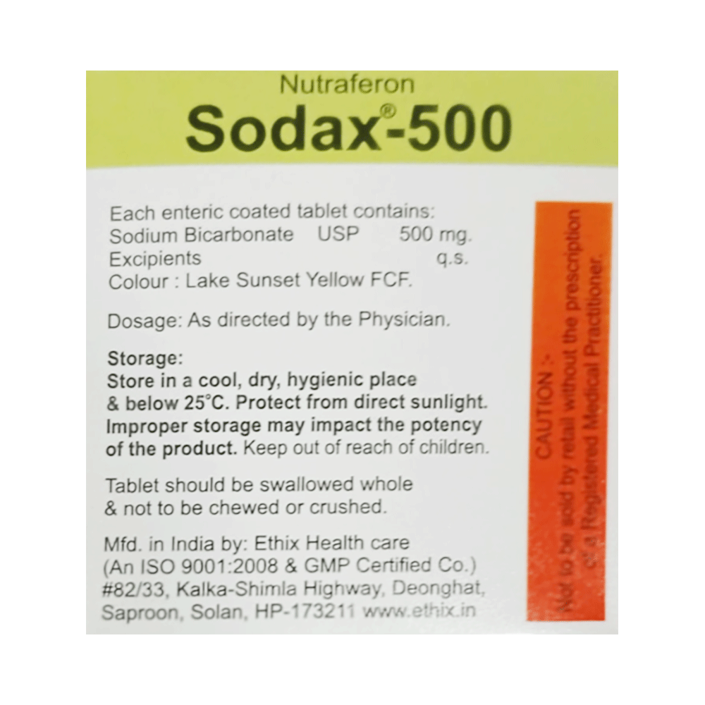 In Treatment of IndigestionIndigestion is a feeling of discomfort or a burning sensation in the upper part of your stomach. It also causes stomach pain and a feeling of fullness. Sodax 500 Tablet treats indigestion and thus gives relief from its symptoms by reducing the amount of acid in the stomach. Sodax 500 Tablet also gives relief from excess gas by breaking trapped gas and allows its easy passage. Take Sodax 500 Tablet as prescribed by the doctor. Think about what foods trigger indigestion and try to avoid them; eat smaller, more frequent meals; try to lose weight if you are overweight, and try to find ways to relax. Avoid eating within 3-4 hours of going to bed.In Treatment of Alkalinizing agentAlkalinizing agents are medicines used to manage disorders associated with low pH. Sodax 500 Tablet is used to treat metabolic acidosis (a condition where there is too much acid in the body) due to kidney failure. It helps restore the lost electrolyte balance and raises the pH of the urine and blood. This prevents complications that may arise due to metabolic acidosis such as osteoporosis, kidney damage, weakening of muscles, fatigue etc. It is given as an injection by a doctor or nurse and should not be self-administered. Follow your doctor’s instructions carefully to get the most benefit.In Treatment of Metabolic acidosisMetabolic acidosis occurs when the body accumulates too much acid or loses too much base, leading to a disrupted pH level. Sodax 500 Tablet acts as a buffer that helps neutralize excess acid and restore a healthier pH level. This prevents further complications related to the acidosis, such as organ dysfunction and electrolyte imbalances. This way it supports the proper functioning of various bodily systems and promotes overall health.show moreshow less