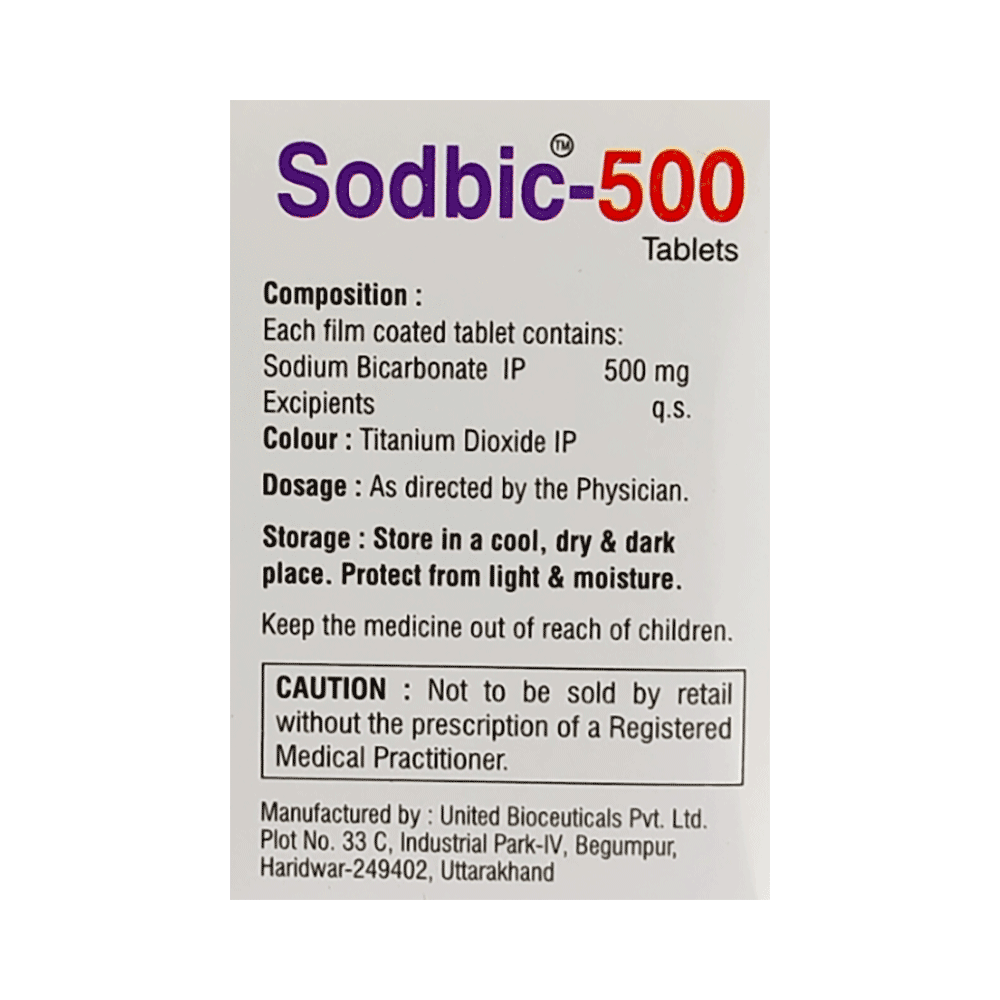 Sodbic 500mg Tablet is an antacid used in the treatment of indigestion, metabolic acidosis and used as an alkalinizing agent. It acts as a buffer that helps neutralize excess acid and restore a healthier pH level in the body. Sodbic 500mg Tablet relieves irritation by producing carbon dioxide which neutralizes the acid present in the stomach. It also increases the pH of blood and urine, thereby correcting acid indigestion, heartburn. Additionally, it helps in the removal of toxic substances from the body in certain types of poisoning.Sodbic 500mg Tablet may be taken with or without food in a dose and duration as advised by the doctor. Excessive intake may cause electrolyte imbalance leading to unwanted side effects. Keep taking this medicine for as long as your doctor recommends. If you stop treatment too early your symptoms may come back and your condition may worsen.Common side effects of this medicine include high sodium levels, cerebral edema, alkalosis, and hypokalemia. Let your doctor know if any of these side effects persist or get worse. They may be able to help by adjusting the dosage or by prescribing you an alternate medicine.It is important to consult a doctor before taking Sodbic 500mg Tablet if you are suffering from stomach and kidney disease. Let your doctor also know about all other medications you are taking as some may affect, or be affected by this medicine. Pregnant or breastfeeding women should also consult their doctor before taking this medicine.