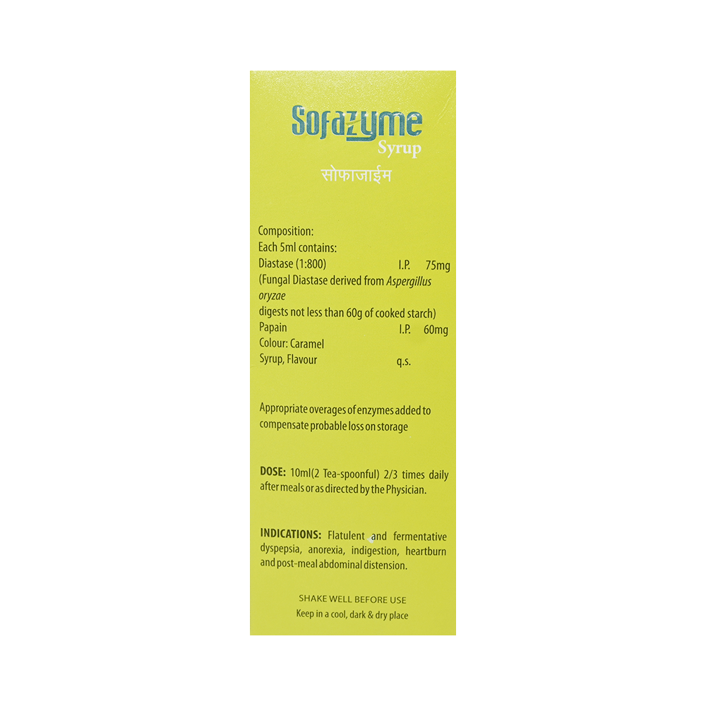 Sofazyme Syrup Palatable No Added Sugar is a digestive enzyme supplement used in the treatment of indigestion/dyspepsia. It helps break down complex food molecules into simpler forms and facilitates better absorption of essential nutrients. This action provides relief from indigestion, bloating, and discomfort after having meals. Sofazyme Syrup Palatable No Added Sugar may be taken with or without food. However, always take it in the dose and duration prescribed by your doctor. Continue taking the medicine for as long as your doctor prescribes it even if you feel better. If you stop taking the medicine abruptly, the symptoms may return. Your dose may be decreased gradually over a few days if the doctor finds it suitable to stop the treatment.Some common side effects of this medicine include nausea, constipation, skin rash, and pruritus. These side effects mostly occur at the initial stage of the treatment and usually disappear within a few days with continued treatment. If any of these symptoms get worse or bother you, consult with the doctor. Do not take Sofazyme Syrup Palatable No Added Sugar if you have a known history of allergic reactions to any of the ingredients of this medicine. Let your doctor know if you are taking, have recently taken, or might take any other medicines. To ensure that this medication is safe for you, let the doctor also know if you have any pre-existing medical conditions, are pregnant, are planning to become pregnant, or are breastfeeding.