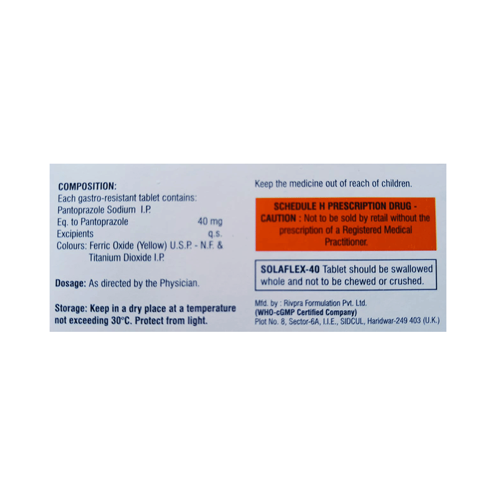 Solaflex 40 Tablet is a medicine that reduces the amount of acid produced in your stomach. It is used for treating acid-related diseases of the stomach and intestine such as heartburn, acid reflux, peptic ulcer disease, and Zollinger-Ellison syndrome. It provides relief from the symptoms and promotes healing. Solaflex 40 Tablet is also used to prevent stomach ulcers and acidity that may be seen with the prolonged use of painkillers. It belongs to a class of medicines known as proton pump inhibitors (PPIs). This medicine should be taken one hour before a meal, preferably in the morning. The dose will depend on your underlying condition and how you respond to the medicine. You should keep on taking it as prescribed even if your symptoms disappear quickly. You can increase the efficiency of the treatment by eating smaller meals more often and avoiding caffeinated drinks (like tea and coffee), and spicy or fatty foods.The most common side effects observed with this medicine include nausea, vomiting, headache, dizziness, flatulence, diarrhea, and stomach pain. These symptoms are generally mild but if they bother you or do not go away, consult your doctor. Long-term use of this medicine may lead to an increased risk of side effects. For instance, using this medicine for more than 1 year may increase your risk for bone fractures, especially with higher doses. Talk to your doctor about ways to prevent bone loss (osteoporosis), like taking calcium and vitamin D supplements.Before taking this medicine, you need to tell your doctor if you have severe liver problems, are taking medicines for HIV, have ever had an allergic reaction to similar medicines in the past, or suffer from bone loss (osteoporosis). Pregnant or breastfeeding women should also consult their doctor before taking it.