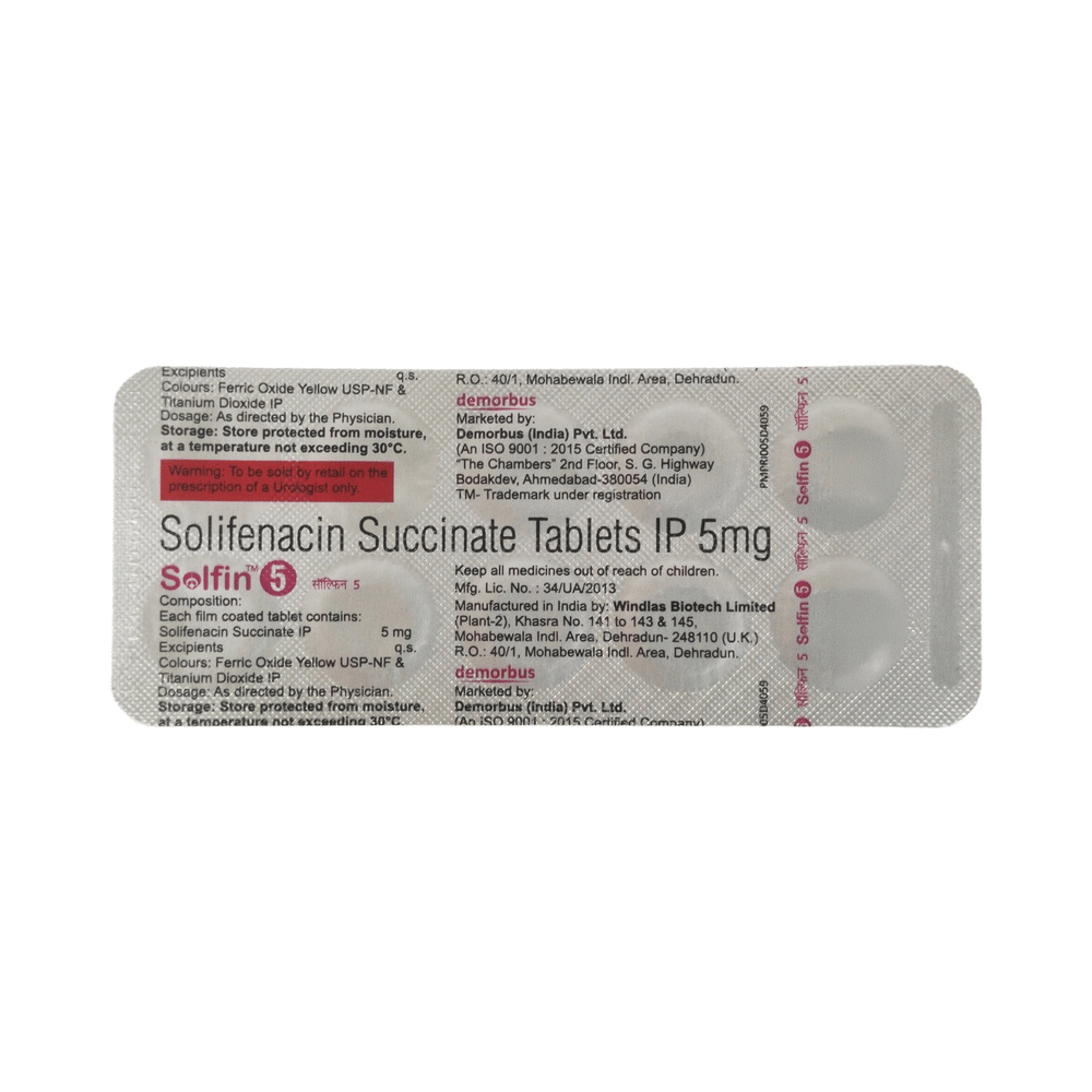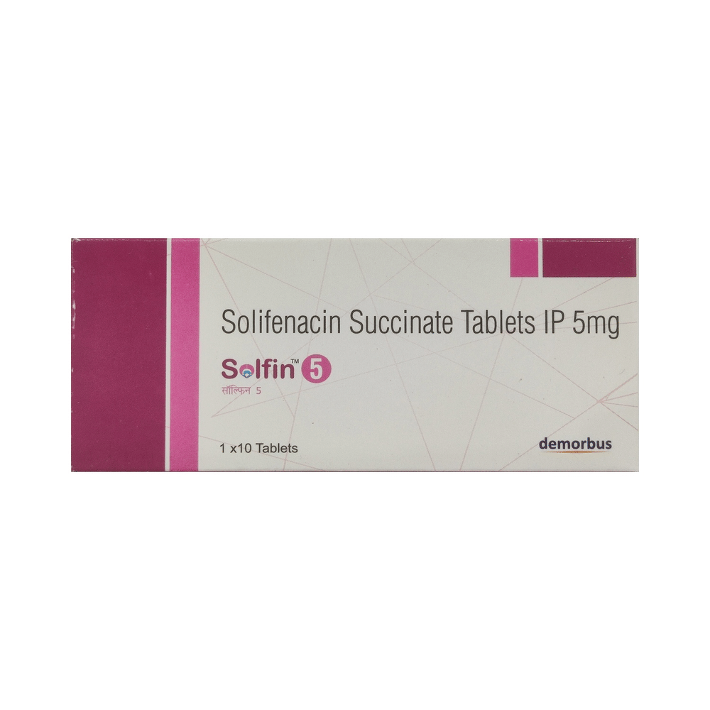 Solfin 5mg Tablet is a muscarinic antagonist that is used in the treatment of overactive bladder. It relieves urinary symptoms like frequent urination, urgent need to urinate, and inability to control urination. Solfin 5mg Tablet is advised to take it in a dose and duration as per prescription. It can be taken with or without food. Swallow the medicine as a whole without crushing or chewing it. You should not stop taking the medicine without consulting the doctor as it may lead to the worsening of your symptoms. The course of the treatment should be completed for better efficacy of the medicine.Some common side effects of this medicine are dry mouth, constipation, nausea, and urinary tract infection. To avoid or cope up with the side effects, you must drink plenty of water. It may also lead to blurry vision or dizziness, so it is advised to avoid driving while on the medication.Before receiving the treatment, inform your doctor if you are on any medication for any other health condition. If you are pregnant or breastfeeding, tell your doctor prior to the treatment. Patients with liver or kidney disease must be cautious while receiving the prescription, and they must receive regular follow-ups as per the doctor’s advice.