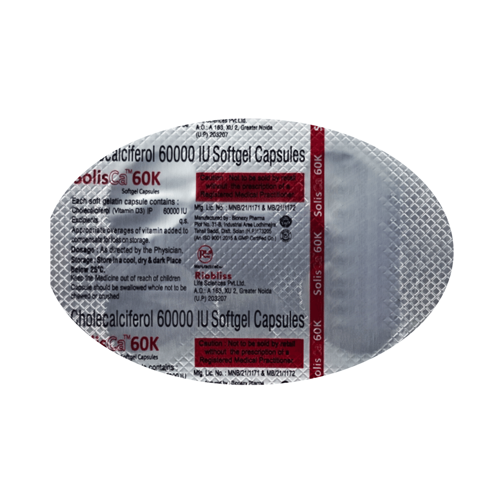 SolisCa 60K Softgel Capsule is a form of vitamin D. It raises vitamin D levels in your blood. This, in turn, increases calcium levels in your blood by helping you absorb more calcium from food.