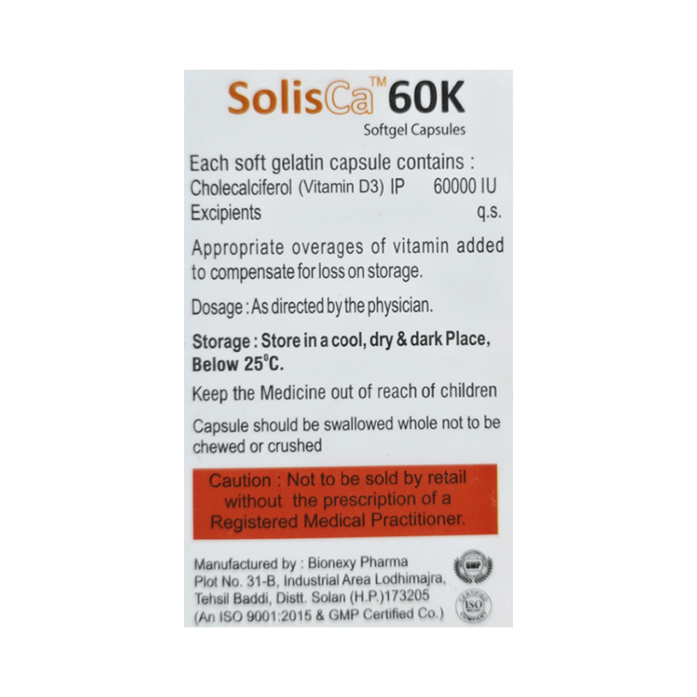 Take this medicine in the dose and duration as advised by your doctor. Swallow it as a whole. Do not chew, crush or break it. SolisCa 60K Softgel Capsule is to be taken with food.