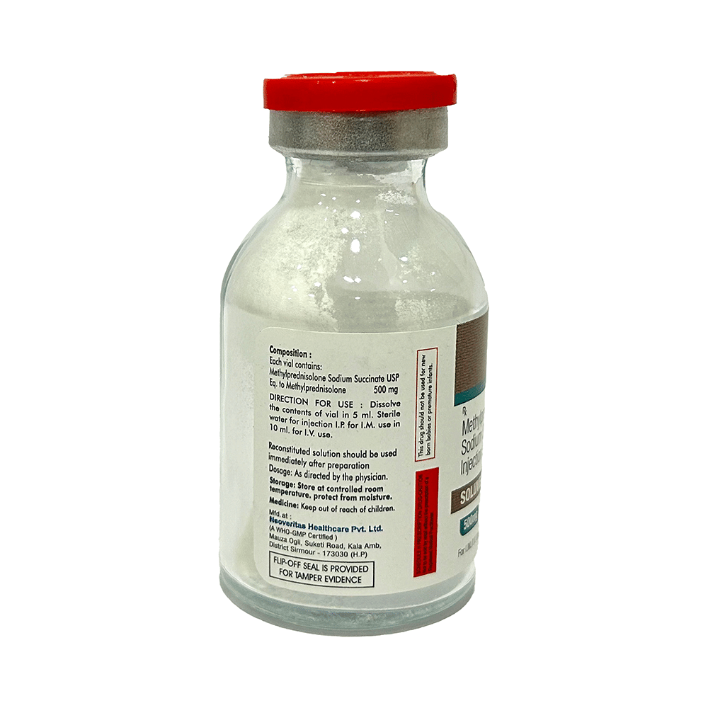 Soluveri 500mg Injection is a type of medicine called a steroid. It is used to treat different conditions including rheumatic disorder, asthma, severe allergic reactions and conditions that affect your eyes and skin. Soluveri 500mg Injection is usually given as an injection by your doctor into a vein, joint, or muscle. The amount you are given will depend on what you are being treated for and how much you need to control your symptoms. If you are using this medication at home, learn exactly how to do it correctly from your doctor. You should always take the amount prescribed. Do not take a larger dose or use it more often. Taking a higher dose will not improve your condition faster, and your risk of side effects will increase. Keep taking it regularly even if you feel well. Do not suddenly stop this medication as your condition may become worse. It should always be stopped gradually.The most common side effects of this medicine include nausea, headache, dizziness, sweating, and swelling in your hands or ankles (edema). If these side effects bother you or will not go away, your doctor may suggest ways of preventing or reducing them. Steroids may also lower your ability to fight infections so avoid being near people who might pass on infections such as measles, chickenpox, or flu. Do not receive a live vaccine while using this medicine. Steroids can affect growth in children.Before using this medicine, you should tell your doctor if you have brittle bones (osteoporosis), mood disorders, high blood pressure, or liver disease. Also, tell your doctor if you have diabetes, this medicine may increase blood glucose levels which can worsen diabetes. Many other drugs may affect, or be affected by, this medicine so let your doctor know all other medicines you are using. This is done to make sure it is safe to use. You should also tell your doctor if you are pregnant, planning to become pregnant or breastfeeding. If this medicine is used for a long time you will be asked for regular monitoring of blood sugar, blood pressure, bone density as well as an eye examination.