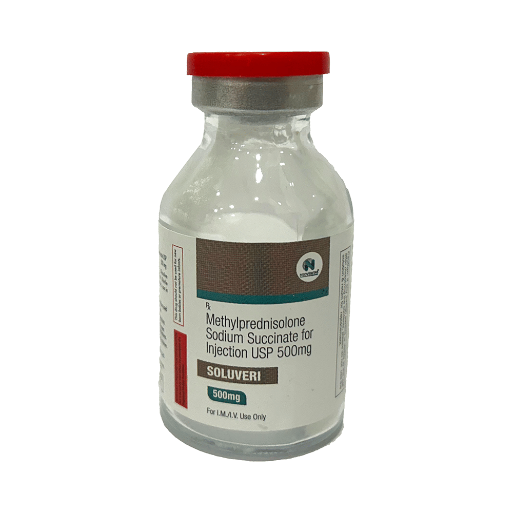 In Treatment of Allergic conditionsSoluveri 500mg Injection is used to treat different inflammatory and allergic conditions including arthritis, lupus, psoriasis, ulcerative colitis which affect the skin, blood, eyes, lungs, stomach, and nervous system. It works by lowering your immune system’s response to these conditions thereby reducing symptoms such as swelling, pain, itching and other allergic-type reactions.This medicine is given orally (by mouth). You should always take it as it has been prescribed for you. Do not stop taking it without your doctor’s advice. This can cause unpleasant withdrawal symptoms. Because this medicine weakens your immune system, you should avoid being near people who are ill or have infections.In Treatment of Systemic lupus erythematosus (SLE)Systemic lupus erythematosus (SLE) is an autoimmune disease. In this disease, the immune system of the body mistakenly attacks healthy tissue. It can affect the skin, joints, kidneys, brain, and other organs. Soluveri 500mg Injection prevents the release of substances in the body that cause inflammation. It lowers your immune system’s response and reduces symptoms such as swelling, pain, itching and other allergic-type reactions.In Treatment of Skin disordersSoluveri 500mg Injection prevents the release of substances in the body that cause inflammation. It can be used to treat different inflammatory and allergic conditions of the skin such as eczema and psoriasis. It works by lowering your immune system’s response to these conditions thereby relieving symptoms such as swelling, pain, itching and other allergic-type reactions.In Treatment of Eye disordersSoluveri 500mg Injection helps relieve symptoms of eye infections such as redness, swelling, itching and watering of eyes. This medicine works by decreasing the production of certain chemicals that cause inflammation of the eyes. This will make it easier for you to go about your daily activities. Use it as prescribed to get the most benefit. If you see no improvement even after a week, talk to your doctor.In Treatment of Rheumatic disorderRheumatic disorder is an autoimmune condition where your body’s immune system (which usually fights bacteria and viruses) attacks your body’s own cells. Soluveri 500mg Injection stops that from happening and can relieve the symptoms of this condition such as pain, swelling, and stiffness in your joints. It can also slow down joint damage, reduce disability, and enable you to be as active for as long as possible. It can take several weeks or months to notice the effect of the medicine. You should continue taking it until your doctor says it is okay to stop using the medicine.show moreshow less