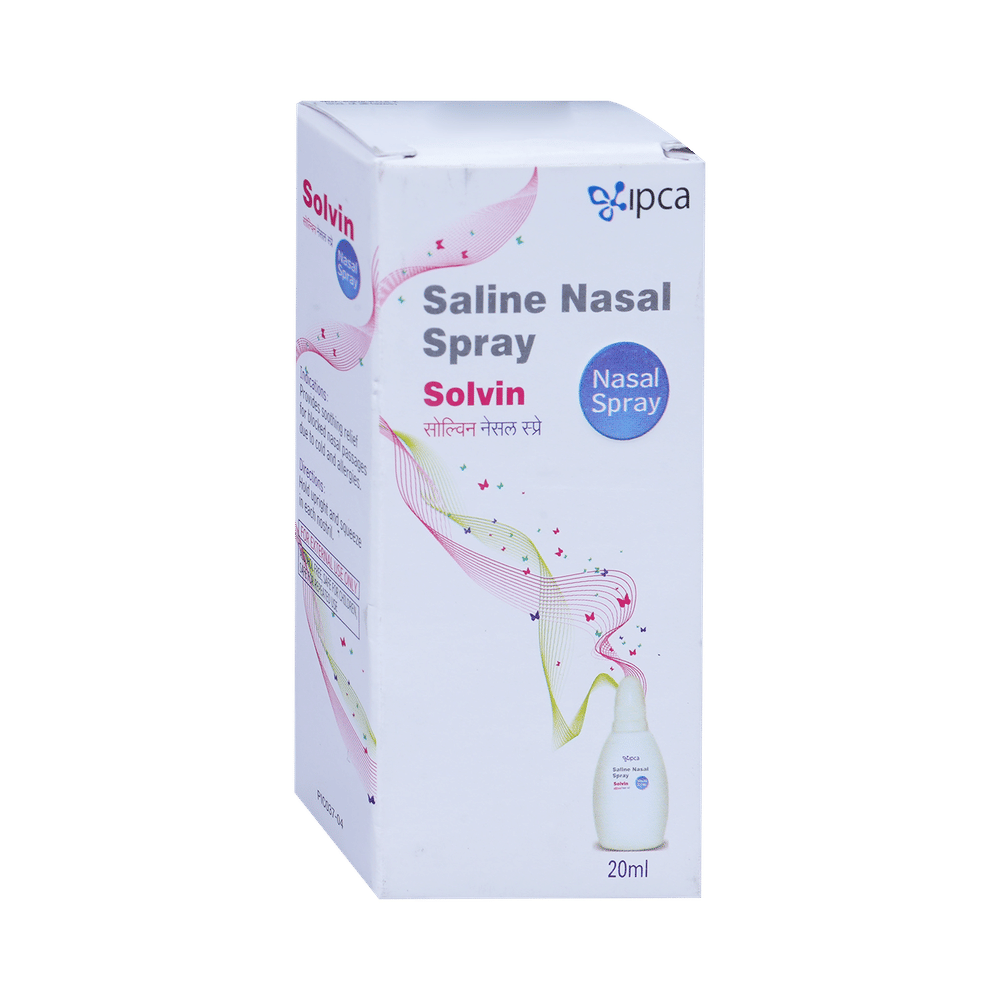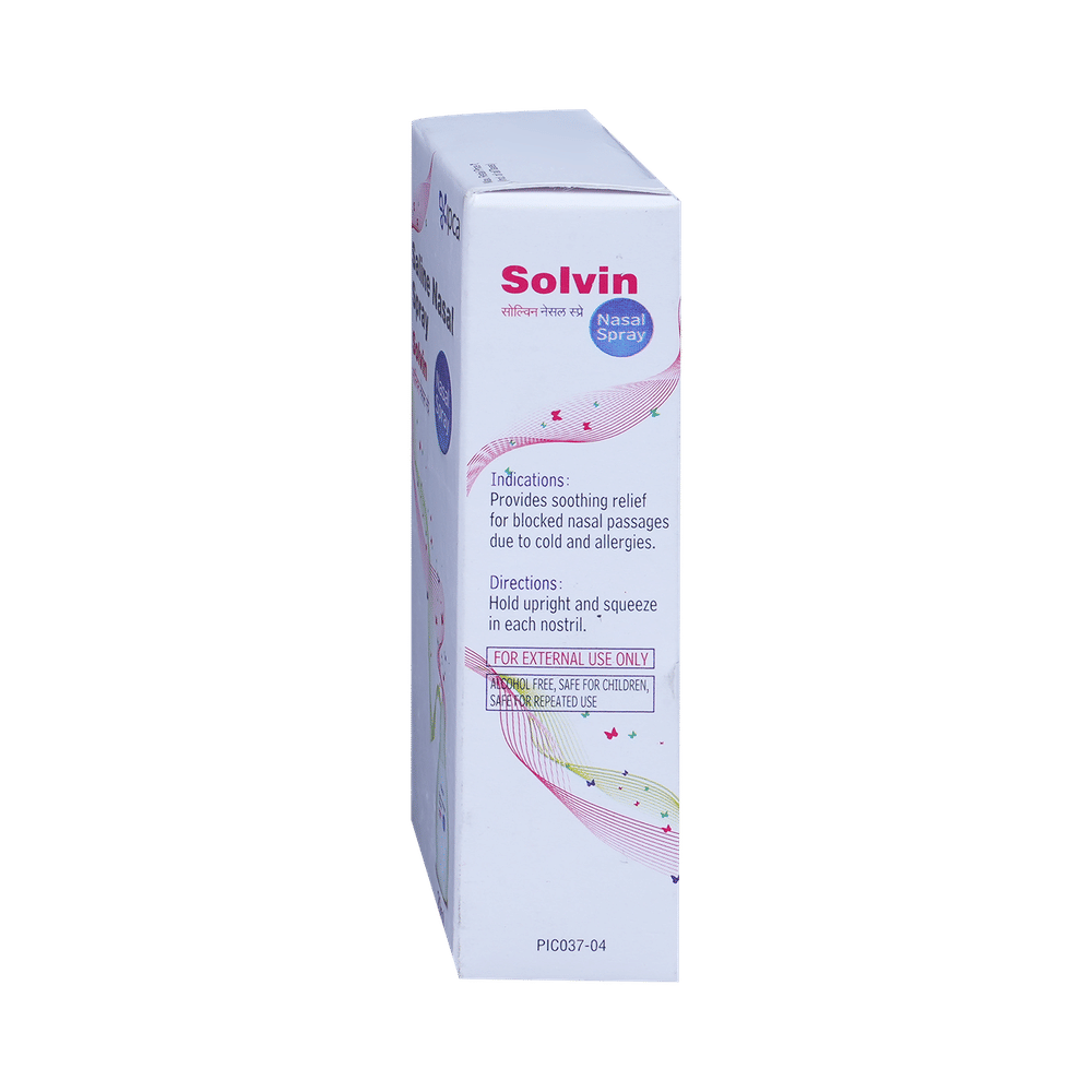 Solvin Nasal Spray comprises of purified salt solution. It is used to treat nasal congestion (blocked nose). It moisturizes and loosens the mucus inside of the nose and provides rapid relief from nasal congestion. Solvin Nasal Spray works by moisturizing the inner surface of the nose. It helps in providing relief from stuffy nose due to common cold or allergies. This medicine is for external use only. You should use it in a dose and duration as advised by your doctor.Before using this medicine, check the label. You have to tilt your head as far back as possible. Hold the dropper close to the nose. Make sure that you do not touch the nozzle. Squeeze the dropper gently so that the medicine gets placed in the nose. After few minutes, you can bend your head forward.It is generally safe with little or no side effects. However, it might cause nasal irritation at the time of application. Before using this medicine, inform your doctor if you are on any medication or are allergic to this medication. Also, inform your doctor if you are pregnant or breastfeeding. Please consult your doctor, if you miss any dose.