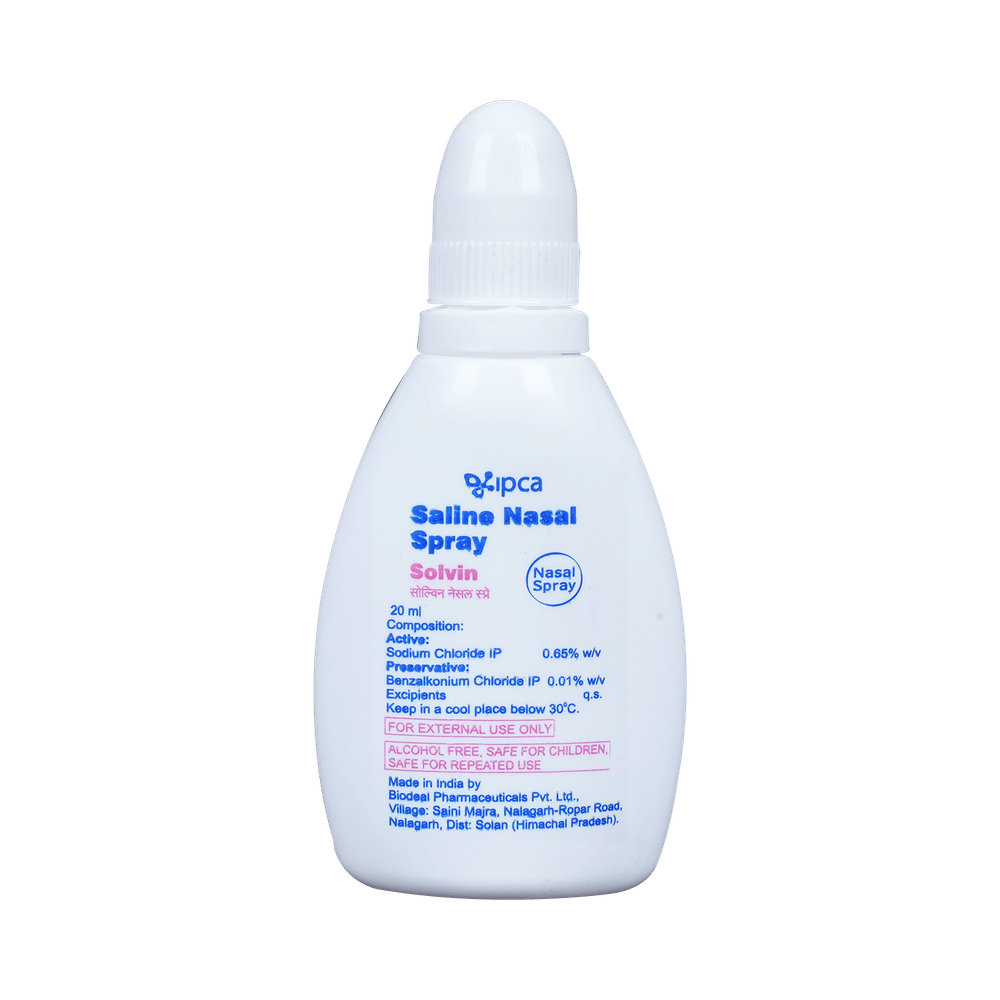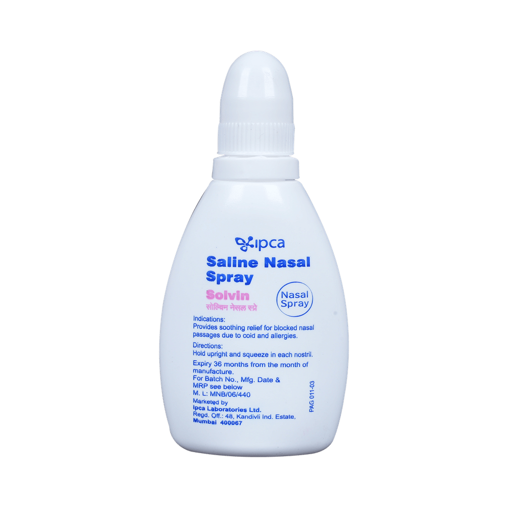 Solvin Nasal Spray is a purified salt solution. It moisturizes the inner surface of the nose and helps relieve stuffy nose due to common cold or allergies.