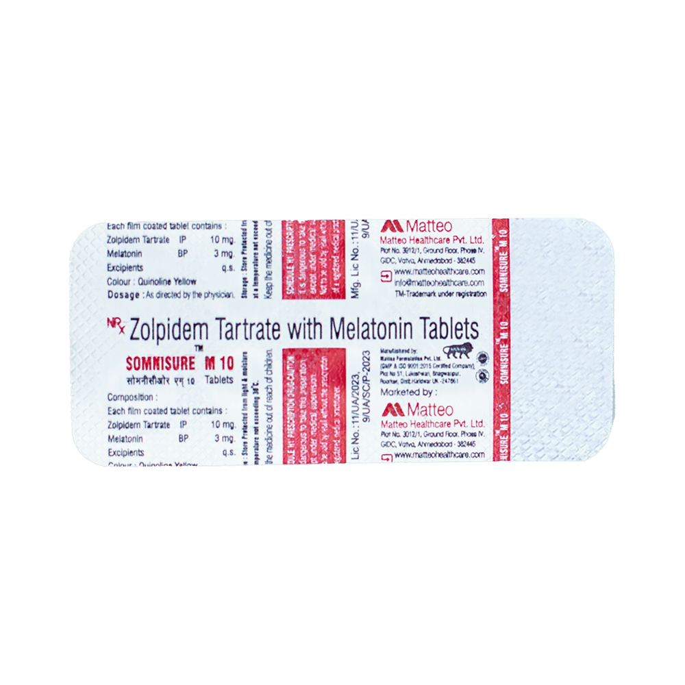 Somnisure M 10 Tablet is a combination medicine used in the treatment of insomnia. It helps to synchronize the body’s biological day-night rhythm. It resolves trouble falling asleep and ensures sound sleep. Somnisure M 10 Tablet is to be taken on an empty stomach, preferably just before bedtime. However, it is advised to take it at a fixed time each day to maintain a consistent level of medicine in the blood. You should never skip any doses and finish the full course of treatment even if you feel better. This medicine should not be stopped suddenly without talking to your doctor.Some common side effects of this medicine include nausea, diarrhea, and headache. It even causes dizziness and sleepiness, so do not drive or do anything that requires mental focus until you know how this medicine affects you. It is important to note that this medicine should not be used for daily naps.Consult your doctor before taking this medicine if you are suffering from any liver or kidney problems. You should avoid smoking and alcohol while using this medicine. Pregnant and breastfeeding mothers should not use this medicine. However, if the need arises, please consult your doctor before using it.