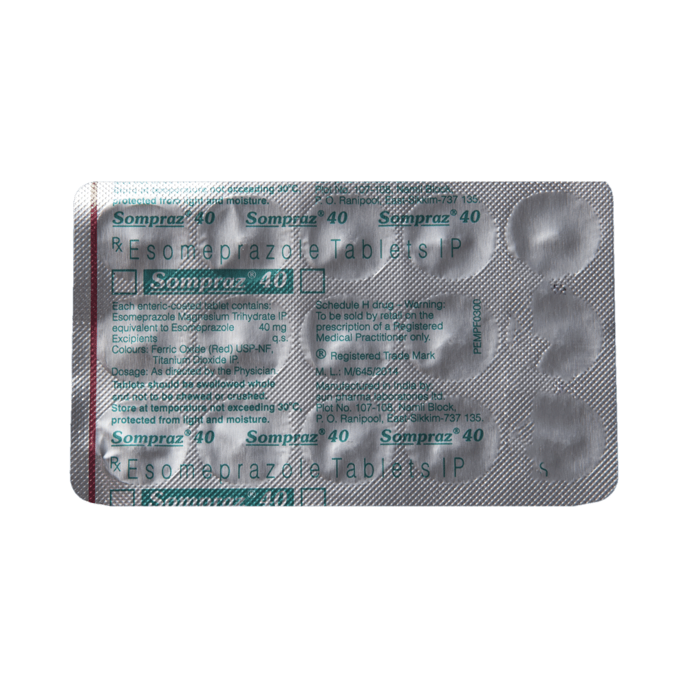 Sompraz 40 Tablet is used to treat conditions related to excessive stomach acid production, such as gastroesophageal reflux disease (GERD), peptic ulcer disease, and Zollinger-Ellison syndrome. It reduces the amount of acid produced in the stomach and provides relief from symptoms and promotes healing. Sompraz 40 Tablet can also be used to prevent stomach ulcers caused by certain medications, such as nonsteroidal anti-inflammatory drugs (NSAIDs). Take it in the exact dose and duration prescribed by your doctor. It is usually taken on an empty stomach, preferably in the morning or at least 1 hour before a meal. Continue taking the medicine even if your symptoms disappear until the doctor says it is okay to stop. If you are taking this medicine for a long time, your doctor may carry out regular tests to check your levels of magnesium which can fall with this medicine.Common side effects include headache, constipation or diarrhea, stomach pain, and nausea. These tend to be mild but talk to your doctor if they bother you or do not go away. The risk of side effects may increase the longer you take this medicine. You may be more likely to have a broken bone if you take it for a long time. It is best to avoid foods that seem to make your symptoms worse, such as rich, spicy, and fatty foods. Cutting down on caffeinated drinks, such as tea, coffee, and cola, as well as alcohol may also help.Sompraz 40 Tablet may not be suitable for some people. Before taking this medicine, you need to tell your doctor if you have severe liver problems, are taking medicines for HIV, have had an allergic reaction to similar medicines in the past, or have osteoporosis. Alcohol does not interfere with the way Sompraz 40 Tablet works; however, drinking alcohol makes your stomach produce more acid than normal. This medicine can make you feel dizzy, or sleepy, or affect your vision. If this happens, do not drive, cycle, or use machinery or tools until you feel better. This medicine is not usually recommended during pregnancy and breastfeeding.