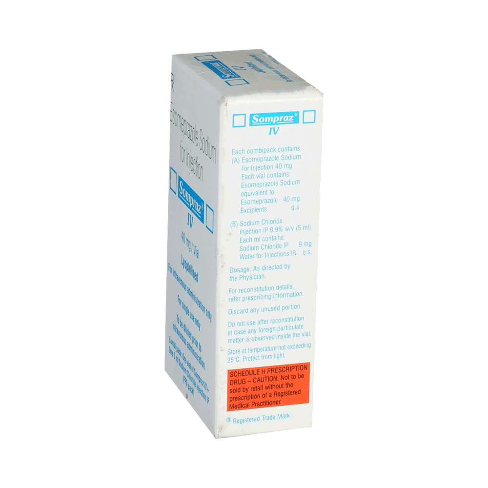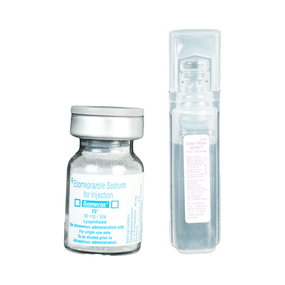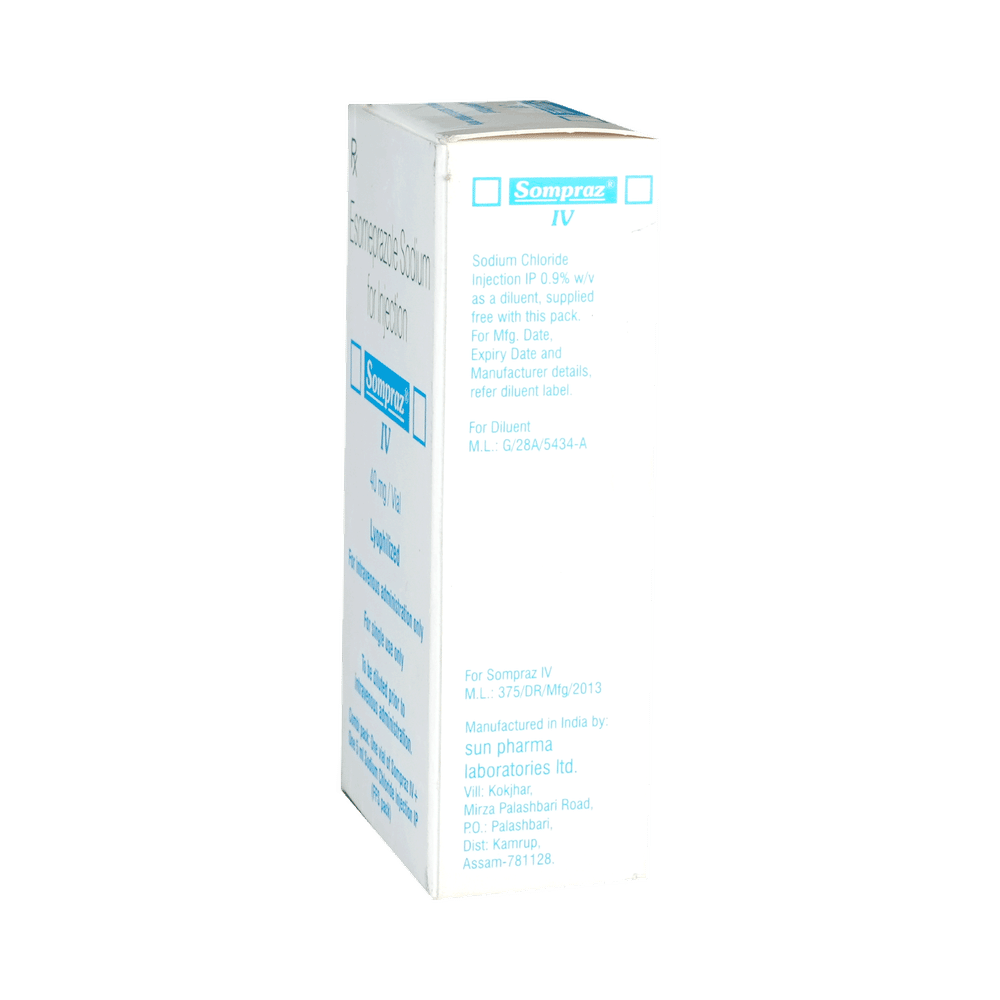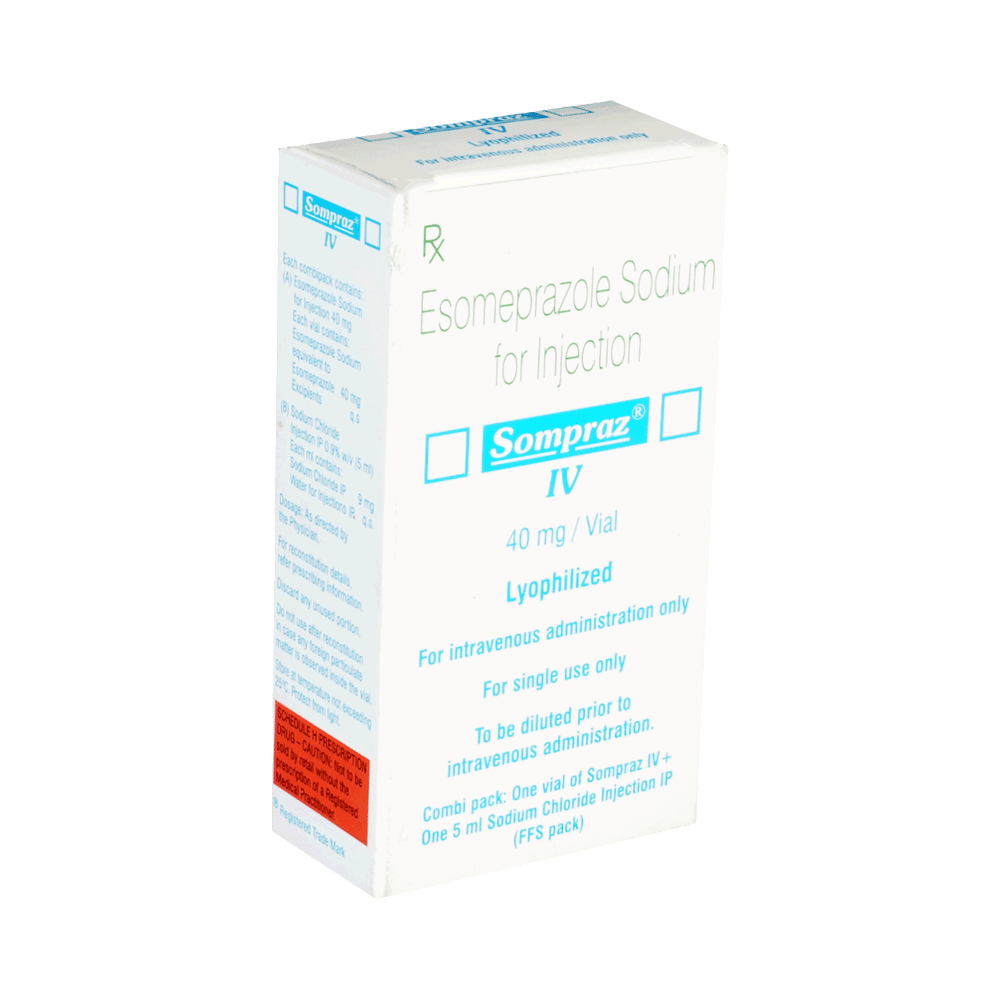 Sompraz 40mg Injection is a medicine that reduces the amount of acid produced in your stomach. It is used for treating acid-related diseases of the stomach and intestine such as acid reflux and some other stomach conditions associated with excessive acid production. Sompraz 40mg Injection is also used to prevent stress ulcers in seriously ill patients and is administered before anesthetic medication to help prevent aspiration-related complications. It belongs to a class of medicines known as proton pump inhibitors (PPIs). This medicine is administered into a vein by a healthcare professional and will only be given to you if your doctor thinks that an injection is more suitable for you at the moment than a tablet. The dose will depend on your underlying condition and how you respond to the medicine. Additionally, your doctor will decide the duration of treatment. You can increase the efficiency of the treatment by eating smaller meals more often and avoiding caffeinated drinks (like tea and coffee), and spicy or fatty foods.The most common side effects observed with this medicine include injection site reactions, nausea, headache, dizziness, flatulence, diarrhea, stomach pain, and fundic gland polyps. These symptoms are generally mild but if they bother you or do not go away, consult your doctor. Talk to your doctor about ways to prevent bone loss (osteoporosis), like taking calcium and vitamin D supplements.Sompraz 40mg Injection is not suitable for some people. Before receiving this injection, you need to tell your doctor if you have severe liver problems, are taking medicines for HIV, have ever had an allergic reaction to similar medicines in the past, or suffer from bone loss (osteoporosis). Pregnant or breastfeeding women should also consult their doctor. Avoid drinking alcohol as it can make your stomach produce excessive acid and may worsen your symptoms.