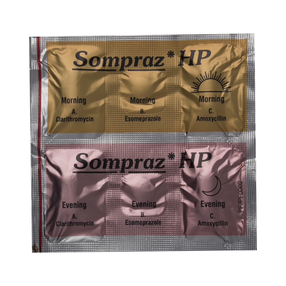 Sompraz HP Combipack is a combination of two antibiotics and an antacid that effectively treats peptic ulcer disease caused due to H. pylori bacterial infection. It fights against the bacteria to treat the infection. It also relieves acidity and discomfort related to the infection. Sompraz HP Combipack is a prescription medicine. It is advised to take it as per the prescription. It should be taken in an empty stomach, but it must be taken at a fixed time to ensure better efficacy. Do not consume more than the recommended dose, as this may have harmful effects on your body. If you miss a dose, take it as soon as you remember. The treatment must be completed even if you feel better.The common side effects of this medicine include nausea, vomiting, diarrhea, and rashes. If any of the side effects get aggravated, you must consult your doctor immediately. If you experience any allergic reaction (rashes, itching, swelling, shortness of breath, etc.), you must seek immediate medical help.Before taking this medicine, you should tell your doctor if you are taking any medicines for any health condition. Pregnant or breastfeeding women should also consult with their doctor before taking it. Avoid drinking alcohol as it can cause excessive drowsiness with this medicine. It usually does not impair your ability to drive, but you should not drive if it makes you feel sleepy or dizzy.