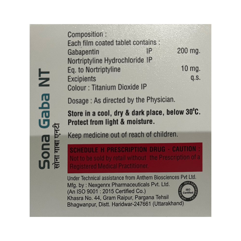 Sona Gaba NT Tablet is a combination of two medicines: Gabapentin and Nortriptyline. Gabapentin is an alpha 2 delta ligand which decreases the pain by modulating calcium channel activity of the nerve cells. Nortriptyline is a tricyclic antidepressant which increases the levels of chemical messengers (serotonin and noradrenaline) that stop the movement of pain signals in the brain. Together, they relieve neuropathic pain (pain from damaged nerves).