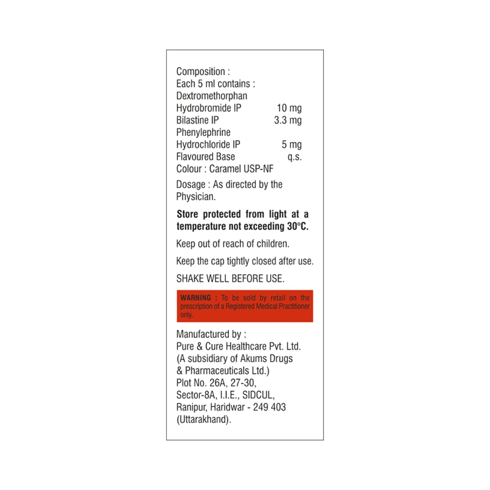 Salt Composition: Dextromethorphan Hydrochloride (10mg/5ml) + Bilastine (3.3mg/5ml) + Phenylephrine (5mg/5ml)