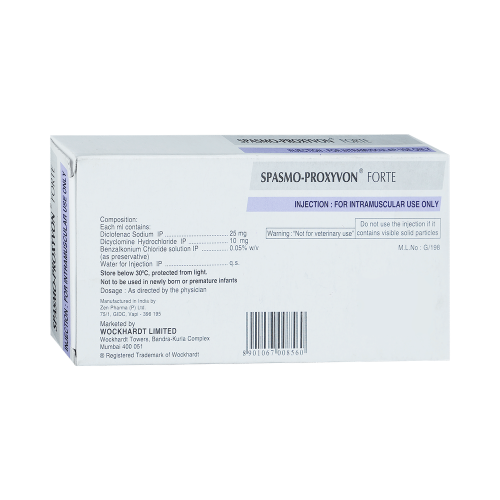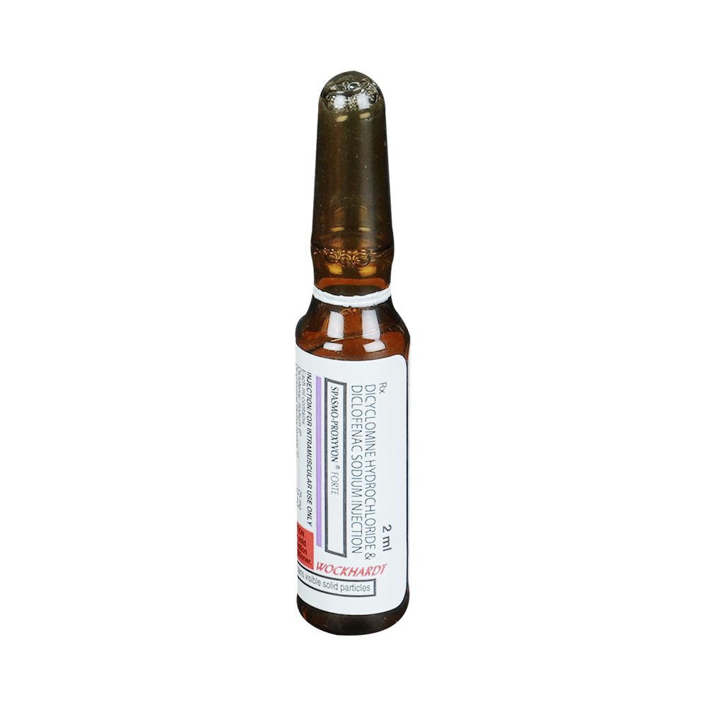 Spasmo-Proxyvon Forte Injection is a combination medicine used in the treatment of abdominal pain. It works by reducing abdominal pain, discomfort, and cramps by relaxing the muscles of the stomach and gut. It also blocks certain chemical messengers that cause pain and fever. Spasmo-Proxyvon Forte Injection is given by your doctor or nurse. The dose you are given will depend on your condition and how you respond to the medicine. You should keep taking Spasmo-Proxyvon Forte Injection for as long as your doctor recommends. If you stop treatment too early, your symptoms may come back, and your condition may worsen.Common side effects of Spasmo-Proxyvon Forte Injection include dry mouth, dizziness, nausea, nervousness, injection site reaction, and blurry vision. These effects are usually temporary and resolve on their own. However, if you experience any severe or persistent symptoms, consult your doctor.Before taking this medicine, you should tell your doctor if you are pregnant, planning pregnancy, or breastfeeding. You should also tell your doctor if you have any kidney or liver diseases so that your doctor can prescribe a suitable dose for you. Let your doctor know about all other medications you are taking, as some may affect, or be affected by, this medicine.