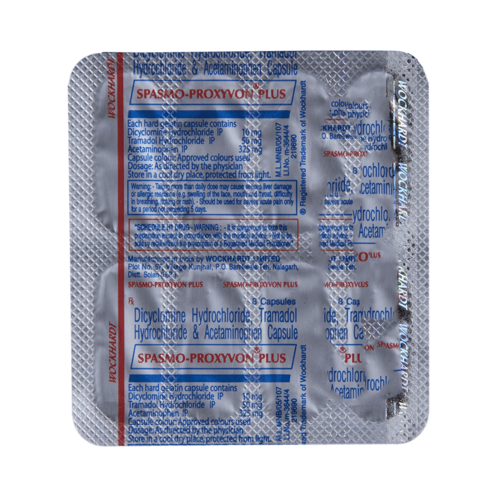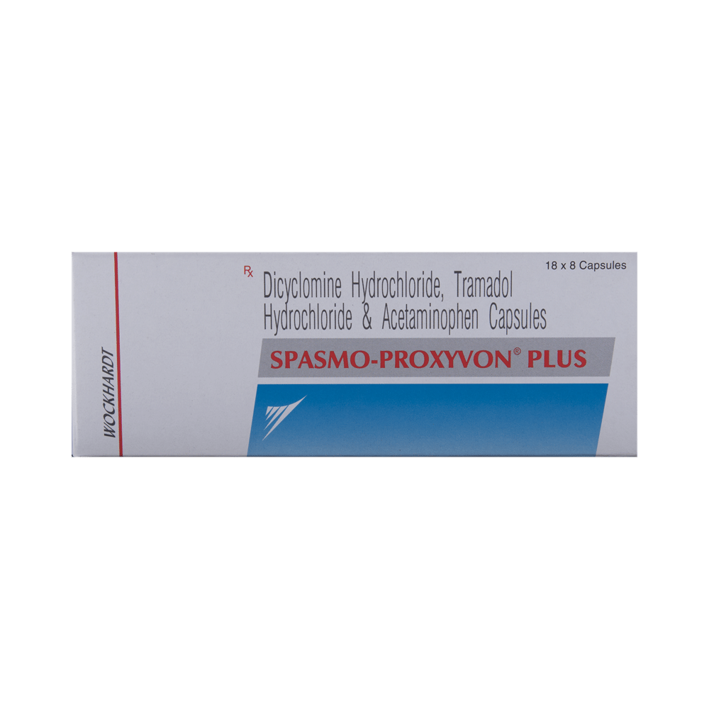 Spasmo-Proxyvon Plus Capsule is a combination of three medicines: Dicyclomine, Paracetamol and Tramadol. Dicyclomine is an anti-cholinergic which relaxes the muscles in the stomach and gut (intestine) and stops sudden muscle contractions (spasms). By doing this, it relieves cramps, pain, bloating, and discomfort. Paracetamol is an analgesic (pain reliever) and anti-pyretic (fever reducer) which works by blocking the release of certain chemical messengers that cause fever and pain. Tramadol is an opioid analgesic (pain reliever) which works by blocking transmission of pain signals to the brain to lower pain perception.