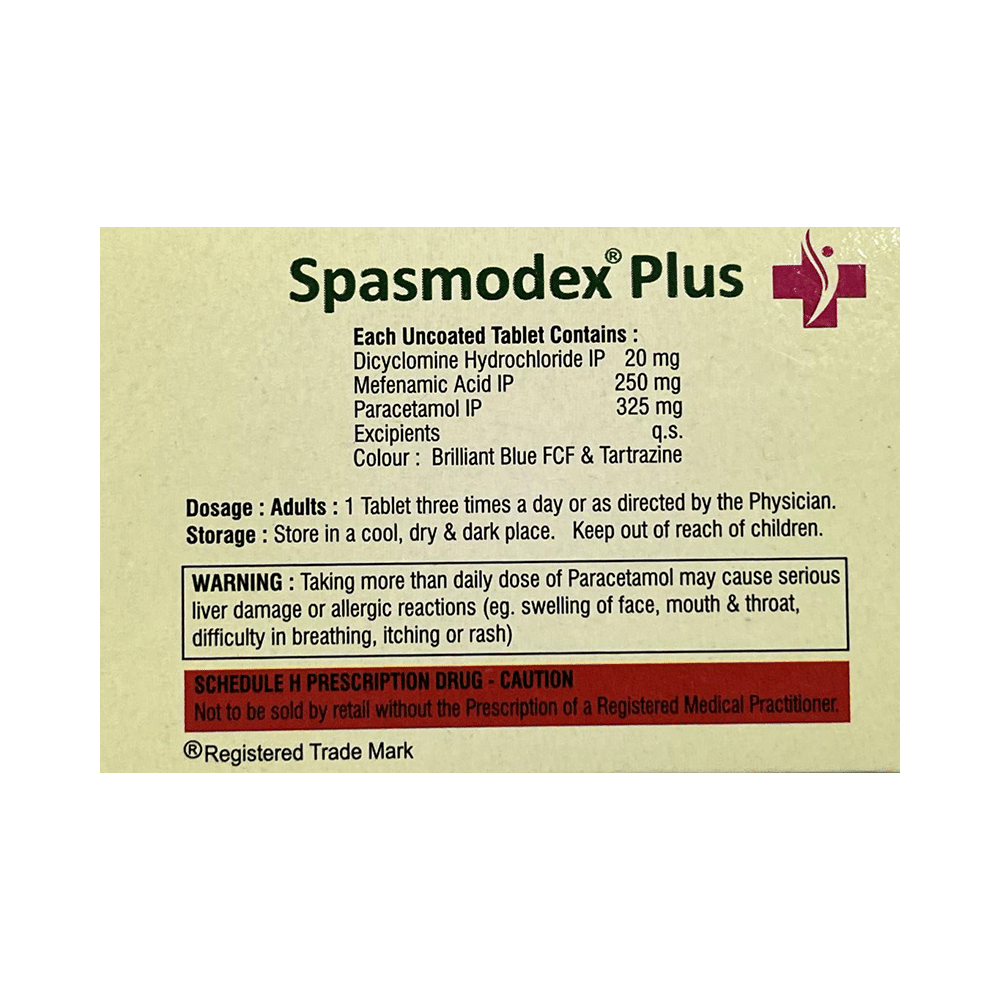 Spasmodex Plus Tablet is a combination of three medicines: Dicyclomine, Paracetamol and Mefenamic Acid which relieve abdominal pain.