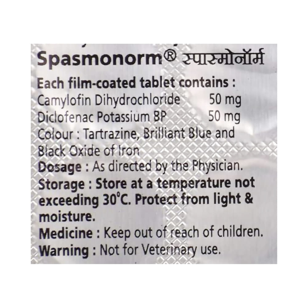 Spasmonorm Tablet is a combination of two medicines: Camylofin and Diclofenac which relieve abdominal pain and cramps. Camylofin is an anticholinergic which relaxes the muscles in the stomach and gut (intestine). It stops sudden muscle contractions (spasms), thereby relieving cramps and pain. Diclofenac is a non-steroidal anti-inflammatory drug (NSAID) which works by blocking the release of certain chemical messengers in the brain that cause abdominal pain and inflammation (swelling).