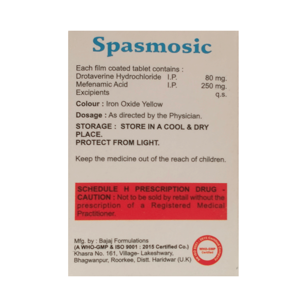 Spasmosic Tablet is a combination of two medicines: Drotaverine and Mefenamic Acid, which relieves abdominal pain and cramps. Drotaverine is an anti-spasmodic medicine which relieves contractions (spasms) associated with smooth muscles in the abdomen. Mefenamic Acid is a non-steroidal anti-inflammatory drug (NSAID). It works by blocking the release of certain chemical messengers that cause abdominal pain and inflammation (swelling).