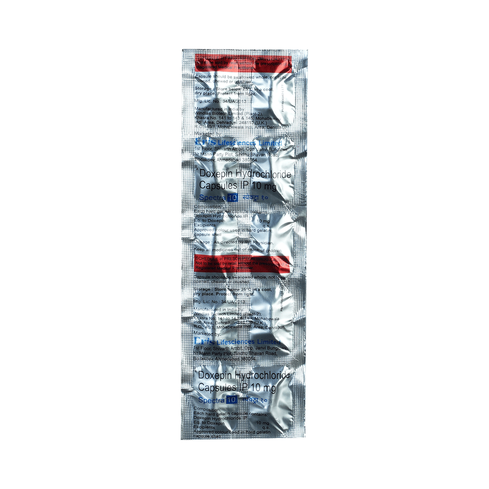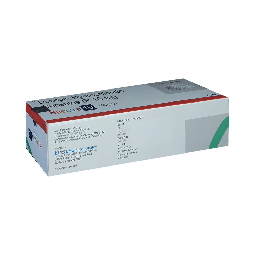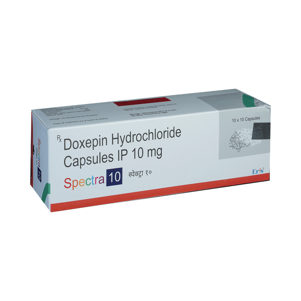 Spectra 10 Capsule is a tricyclic antidepressant. It is used in the treatment of insomnia (difficulty in sleeping). It is also used in patients intolerant of or unresponsive to alternative (other) treatment options for depression and anxiety disorders. Spectra 10 Capsule works by increasing the levels of chemical messengers in the brain that stabilizes and enhances the mood. It is usually advised to take it before bedtime because it can make you feel drowsy. It can be taken with or without food, but you should take it at a fixed time each day for better efficacy. The dose and duration will be decided by your doctor so that you get the right amount to control your symptoms. If you have missed any dose, take it as soon as you remember it. Do not skip any dose and finish the full course of treatment even if you feel better. This medication must not be stopped suddenly without talking to the doctor. Your dose may be modified or gradually decreased before stopping the medicine.The most common side effects of this medicine include increased heart rate, blurred vision, dryness in the mouth, difficulty in urination, and constipation. Initially, this medicine may also cause a sudden drop in blood pressure, especially when you change positions. It may even cause dizziness and sleepiness, so do not drive or do anything that requires mental focus until you know how this medicine affects you. To lower the chances of dizziness, rise slowly if you have been sitting or lying down. It may also lead to weight gain in some people. Most of the common side effects tend to be mild and temporary. Your doctor may be able to suggest ways of preventing or reducing side effects if they bother you or do not go away. Serious side effects associated with this medicine are rare.Before taking this medicine, it is important to tell your doctor if you are taking or have recently taken any other medicines for the same or any other diseases. Pregnant and breastfeeding women should take this medicine with proper consultation and caution. This medicine is not known to be addictive, but you can experience additional side effects (withdrawal symptoms) if you stop taking it suddenly. If you notice any sudden mood change or get suicidal or self-harm thoughts, you must consult the doctor without delay. Also, remember to take this medicine as advised by the doctor as an overdose of this medication may lead to a serious health emergency. Consumption of alcohol should be avoided as alcohol interacts with this medicine to cause serious health issues.