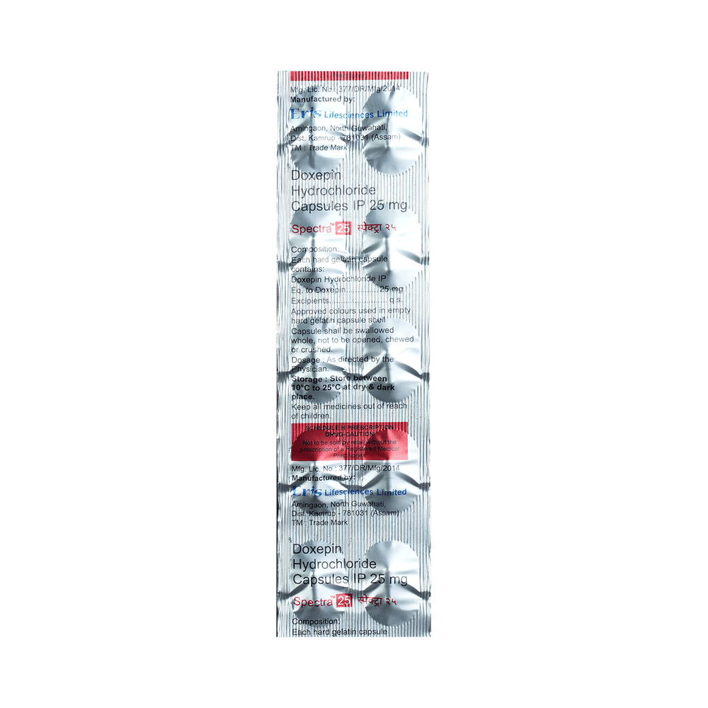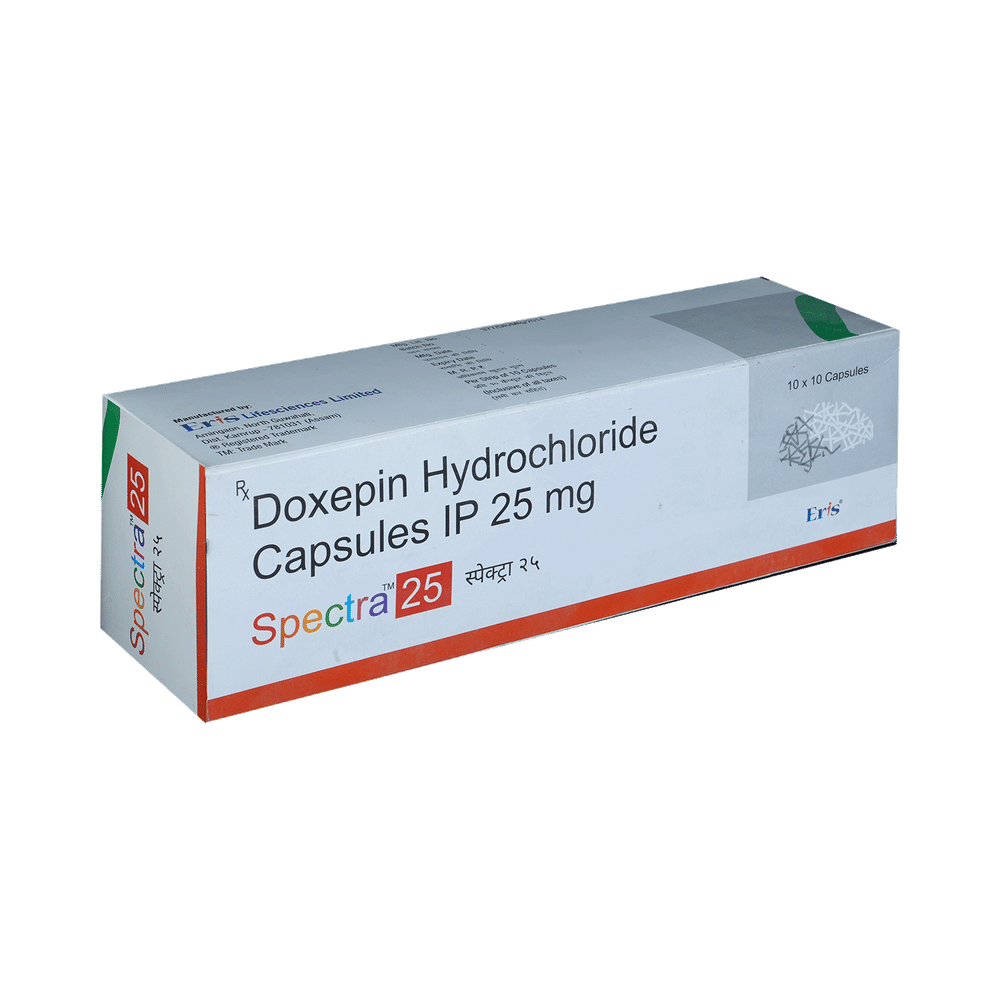 Spectra 25mg Capsule is a tricyclic antidepressant. It is used in the treatment of insomnia (difficulty in sleeping). It is also used in patients intolerant of or unresponsive to alternative (other) treatment options for depression and anxiety disorders. Spectra 25mg Capsule works by increasing the levels of chemical messengers in the brain that stabilizes and enhances the mood. It is usually advised to take it before bedtime because it can make you feel drowsy. It can be taken with or without food, but you should take it at a fixed time each day for better efficacy. The dose and duration will be decided by your doctor so that you get the right amount to control your symptoms. If you have missed any dose, take it as soon as you remember it. Do not skip any dose and finish the full course of treatment even if you feel better. This medication must not be stopped suddenly without talking to the doctor. Your dose may be modified or gradually decreased before stopping the medicine.The most common side effects of this medicine include increased heart rate, blurred vision, dryness in the mouth, difficulty in urination, and constipation. Initially, this medicine may also cause a sudden drop in blood pressure, especially when you change positions. It may even cause dizziness and sleepiness, so do not drive or do anything that requires mental focus until you know how this medicine affects you. To lower the chances of dizziness, rise slowly if you have been sitting or lying down. It may also lead to weight gain in some people. Most of the common side effects tend to be mild and temporary. Your doctor may be able to suggest ways of preventing or reducing side effects if they bother you or do not go away. Serious side effects associated with this medicine are rare.Before taking this medicine, it is important to tell your doctor if you are taking or have recently taken any other medicines for the same or any other diseases. Pregnant and breastfeeding women should take this medicine with proper consultation and caution. This medicine is not known to be addictive, but you can experience additional side effects (withdrawal symptoms) if you stop taking it suddenly. If you notice any sudden mood change or get suicidal or self-harm thoughts, you must consult the doctor without delay. Also, remember to take this medicine as advised by the doctor as an overdose of this medication may lead to a serious health emergency. Consumption of alcohol should be avoided as alcohol interacts with this medicine to cause serious health issues.