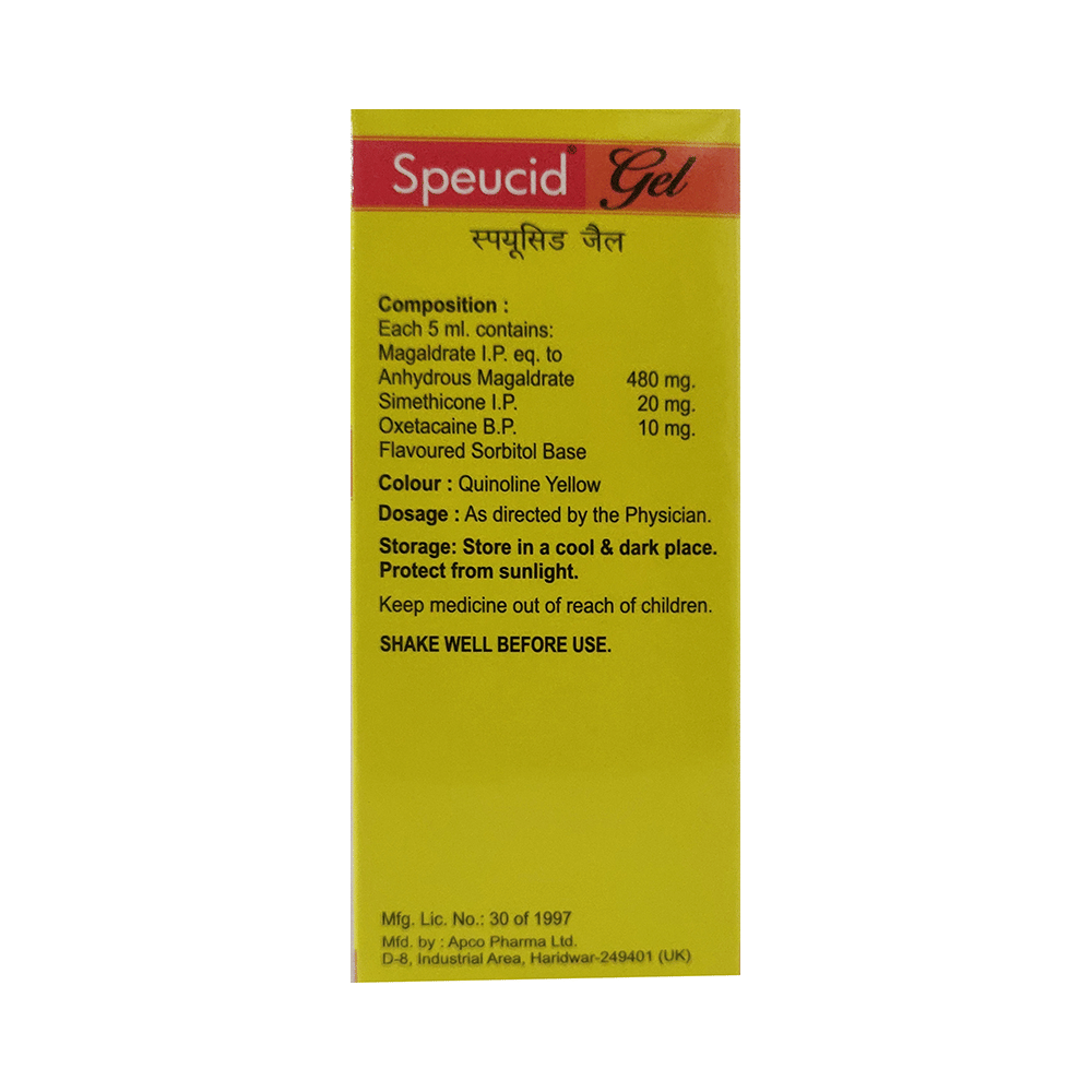 In Treatment of AciditySpeucid Gel Sugar Free Cardamom relieves excessive acidity in your stomach which prevents heartburn and indigestion. Usually, it is used along with other medicines for management of your condition. Continue taking it for as long as the doctor may advise you to. You need to take this medicine regularly to get the most out of it. Take a fiber-rich diet, avoid oily or spicy food and drink plenty of fluids while taking it to make sure you stay hydrated.In Treatment of HeartburnHeartburn is a burning feeling in your chest caused by stomach acids travelling back up towards your throat and mouth (acid reflux). Speucid Gel Sugar Free Cardamom improves the movement of food in the stomach and helps prevent heartburn.You should take it exactly as it is prescribed or as it says on the label for it to be effective. Some simple lifestyle changes can help stop or reduce heartburn. Think about what foods trigger heartburn and try to avoid them; eat smaller, more frequent meals; try to lose weight if you are overweight and try to find ways to relax. Do not eat within 3 to 4 hours of going to bed.In Treatment of Stomach ulcersStomach ulcers are painful sores that develop in the inner lining of the stomach or gut (intestine). Speucid Gel Sugar Free Cardamom reduces the amount of acid your stomach makes which prevents further damage to the ulcer as it heals naturally. You may be given other medicines along with this medicine depending on what caused the ulcer. You need to keep taking Speucid Gel Sugar Free Cardamom as prescribed by the doctor for it to be effective, even if the symptoms seem to disappear.show moreshow less