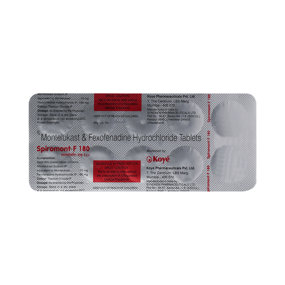 Spiromont-F 180 Tablet is a combination medicine used in the treatment of allergy symptoms such as runny nose, stuffy nose, sneezing, watery eyes, and congestion or stuffiness. Spiromont-F 180 Tablet is taken with or without food in a dose and duration as advised by the doctor. The dose you are given will depend on your condition and how you respond to the medicine. You should keep taking this medicine for as long as your doctor recommends. If you stop treatment too early your symptoms may come back and your condition may worsen. Let your healthcare team know about all other medications you are taking as some may affect, or be affected by this medicine.The most common side effects include nausea, diarrhea, vomiting, skin rash, flu-like symptoms, and headache. Most of these are temporary and usually resolve with time. Contact your doctor straight away if you are at all concerned about any of these side effects. This medicine may cause dizziness and sleepiness, so do not drive or do anything that requires mental focus until you know how this medicine affects you. Avoid drinking alcohol while taking this medicine as it can worsen your sleepiness.Never support self-medication or recommend your medicine to another person. It is beneficial to have plenty of fluids while taking this medication. Before you start taking this medicine it is important to inform your doctor if you are suffering from liver or kidney disease. You should also tell your doctor if you are pregnant, planning pregnancy or breastfeeding.