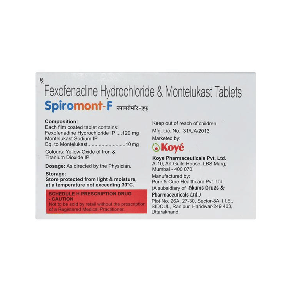 Spiromont-F Tablet is a combination medicine used in the treatment of allergy symptoms such as runny nose, stuffy nose, sneezing, watery eyes, and congestion or stuffiness. Spiromont-F Tablet is taken with or without food in a dose and duration as advised by the doctor. The dose you are given will depend on your condition and how you respond to the medicine. You should keep taking this medicine for as long as your doctor recommends. If you stop treatment too early your symptoms may come back and your condition may worsen. Let your healthcare team know about all other medications you are taking as some may affect, or be affected by this medicine.The most common side effects include nausea, diarrhea, vomiting, skin rash, flu-like symptoms, and headache. Most of these are temporary and usually resolve with time. Contact your doctor straight away if you are at all concerned about any of these side effects. This medicine may cause dizziness and sleepiness, so do not drive or do anything that requires mental focus until you know how this medicine affects you. Avoid drinking alcohol while taking this medicine as it can worsen your sleepiness.Never support self-medication or recommend your medicine to another person. It is beneficial to have plenty of fluids while taking this medication. Before you start taking this medicine it is important to inform your doctor if you are suffering from liver or kidney disease. You should also tell your doctor if you are pregnant, planning pregnancy or breastfeeding.