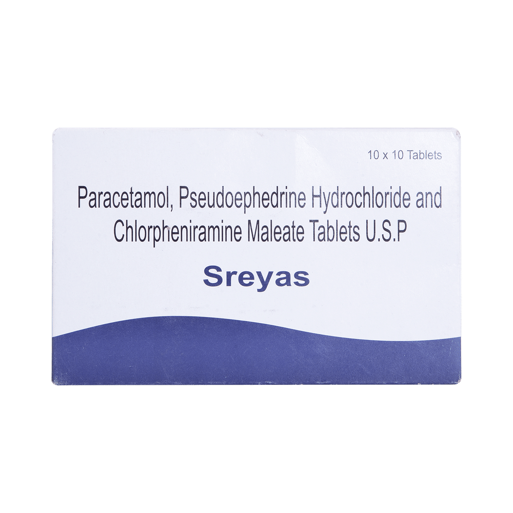 Sreyas Tablet is a medicine used in the treatment of common cold symptoms. It provides relief from symptoms such as headache, sore throat, runny nose, muscular pain, and fever. Sreyas Tablet can be taken with or without food. The dose and duration will depend on the severity of your condition. You should keep taking the medicine even if you feel better until the doctor says it is alright to stop using it.Using this medicine may cause few common side effects such as nausea, allergic reaction, sleepiness, dizziness, restlessness, and nervousness. If any of these side effects do not resolve with time or get worse, you should let your doctor know. Your doctor may be able to suggest ways of preventing or reducing the side effects. In general, you should try to use the smallest amount necessary to control your symptoms.Before using the medicine, you should tell your doctor if you have any other medical conditions or disorders. To make sure it is safe, you should let your doctor know all the other medicines you are taking. Also, tell your doctor if you have any problems with liver or kidneys. You should avoid consumption of alcohol while on treatment with this medicine. Pregnant and breastfeeding women should consult their doctors first before using the medicine.